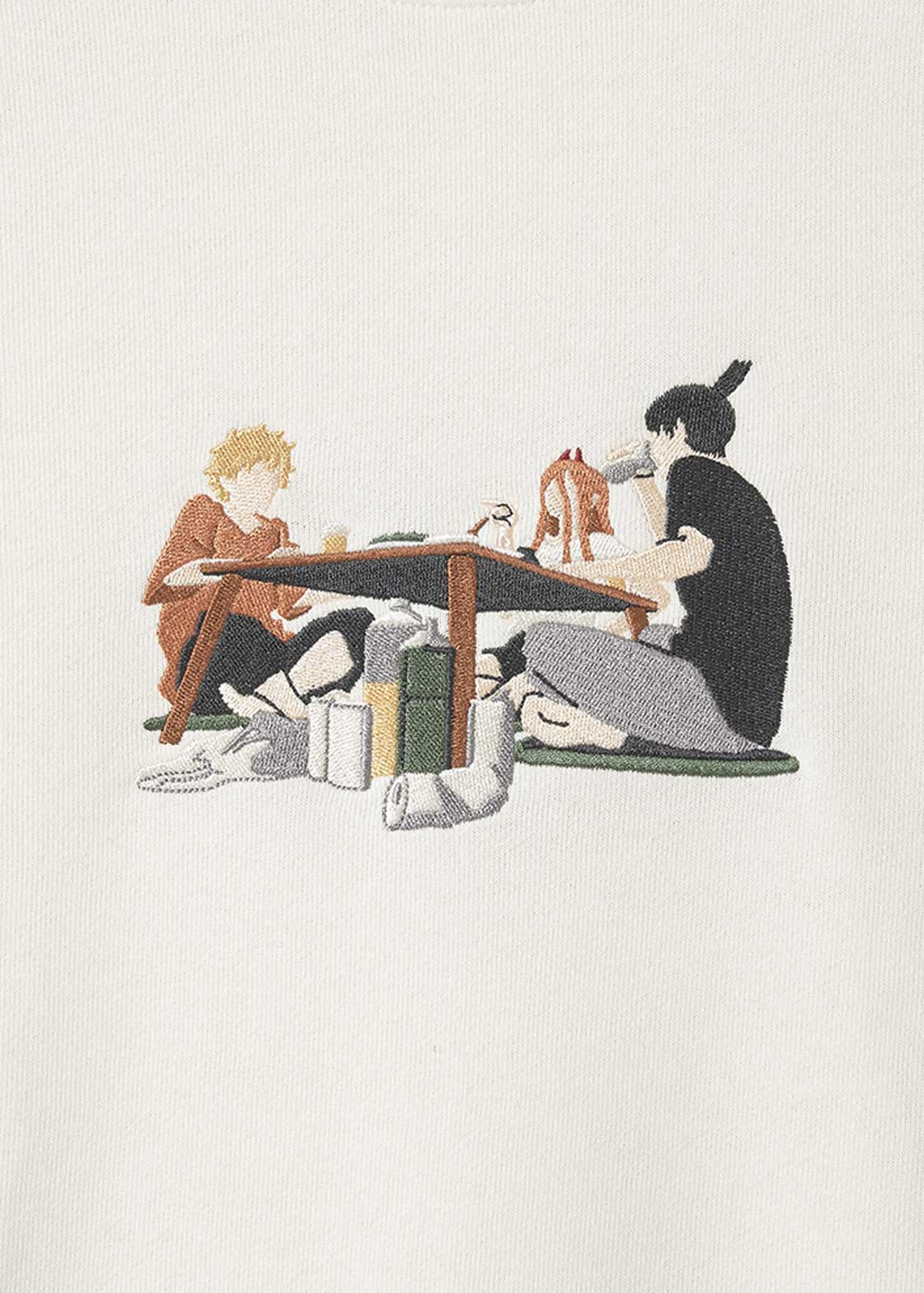 共同生活を送るデンジ、早川アキ、パワーが一緒に食卓を囲む姿を刺繍で表現しました。バックには伸びをするニャーコの刺繍があしらわれ、ひとときの穏やかな日常を感じられるデザインです。