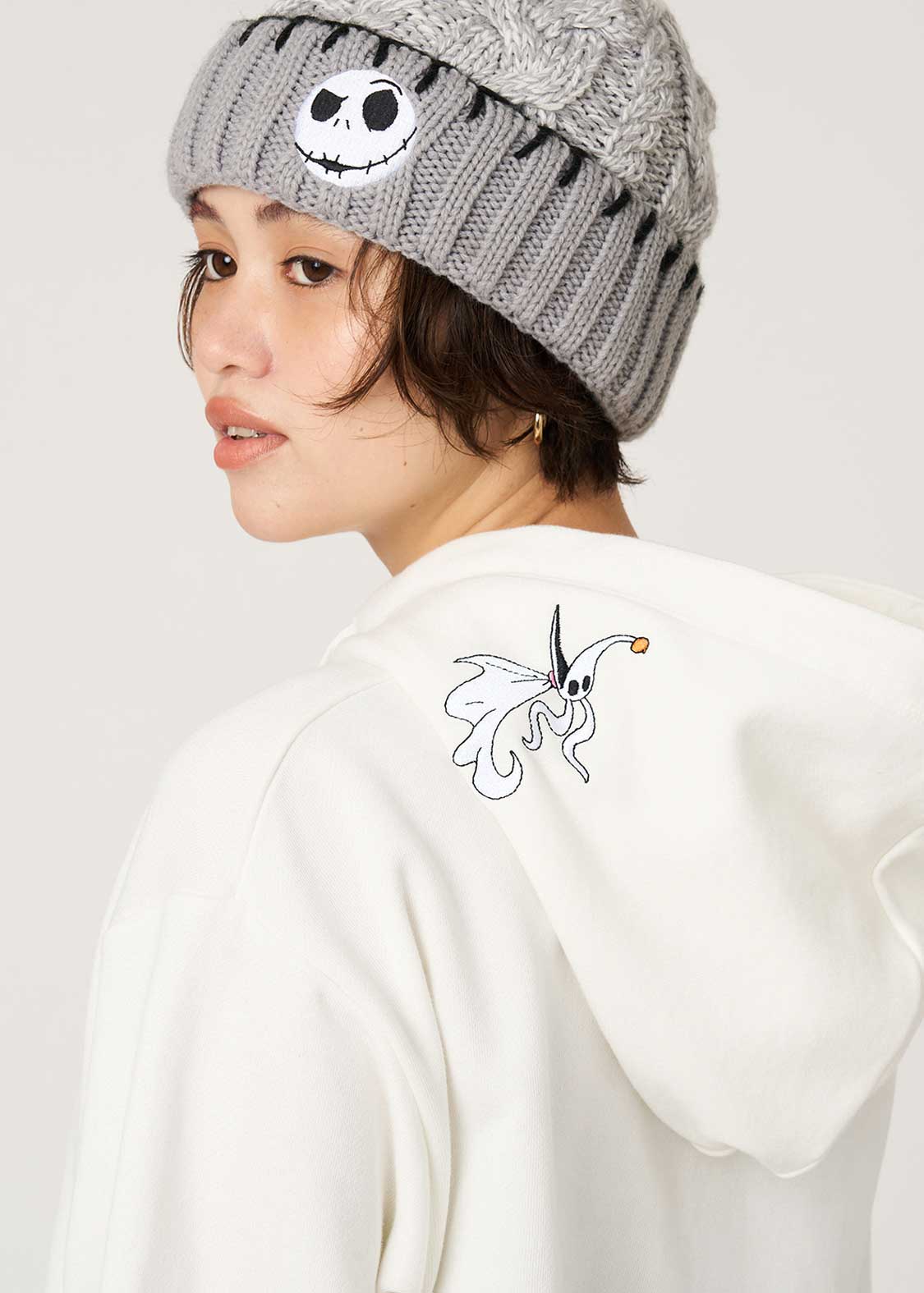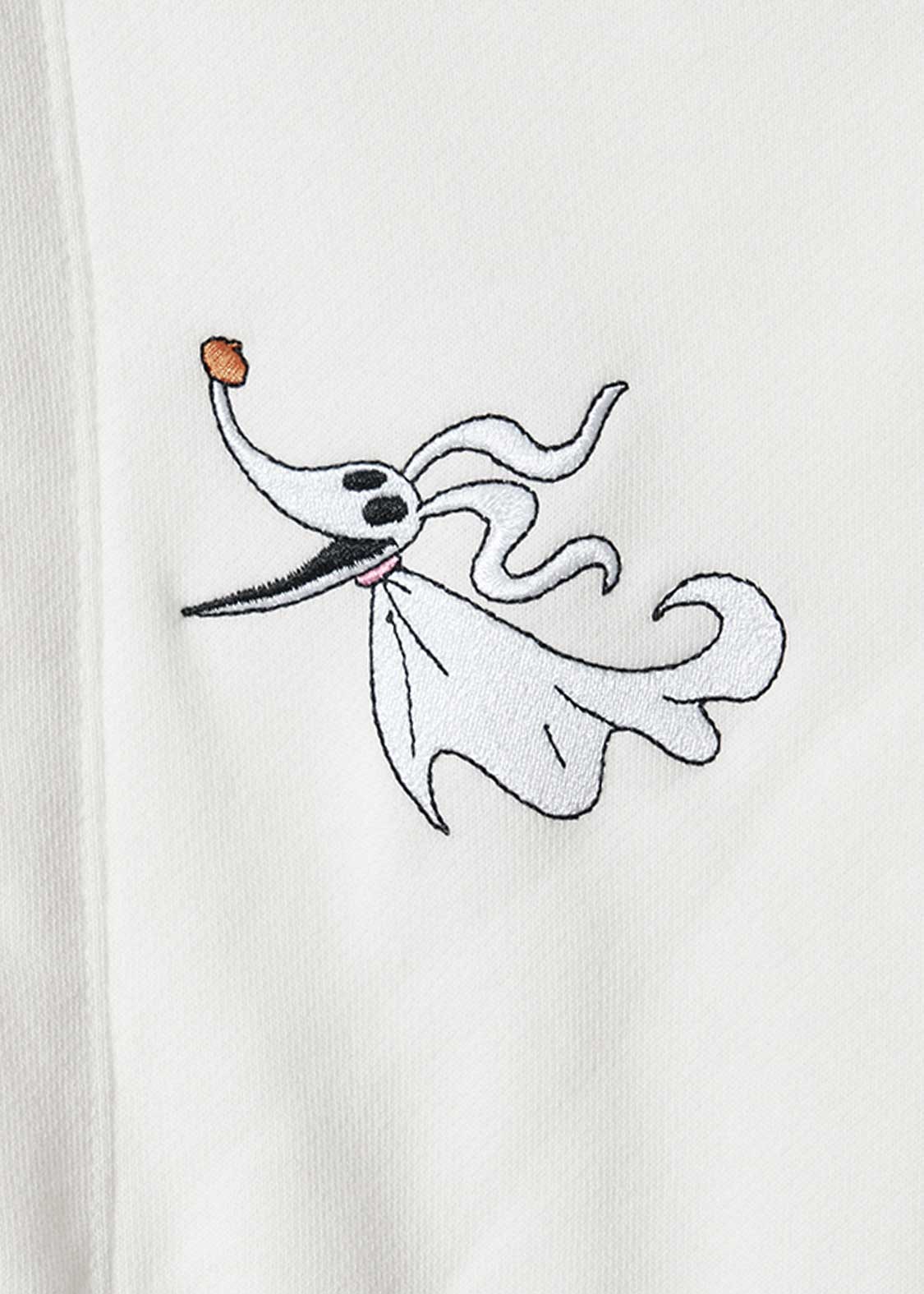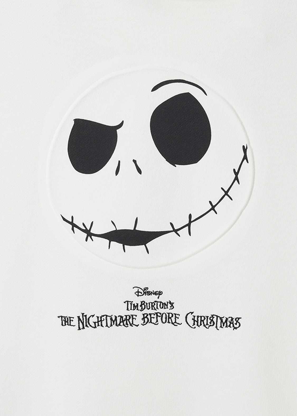 エンボス加工でジャックの顔をダイナミックに表現し、ロゴを刺繍であしらったデザイン。フードにはゼロの刺繍も施されています。