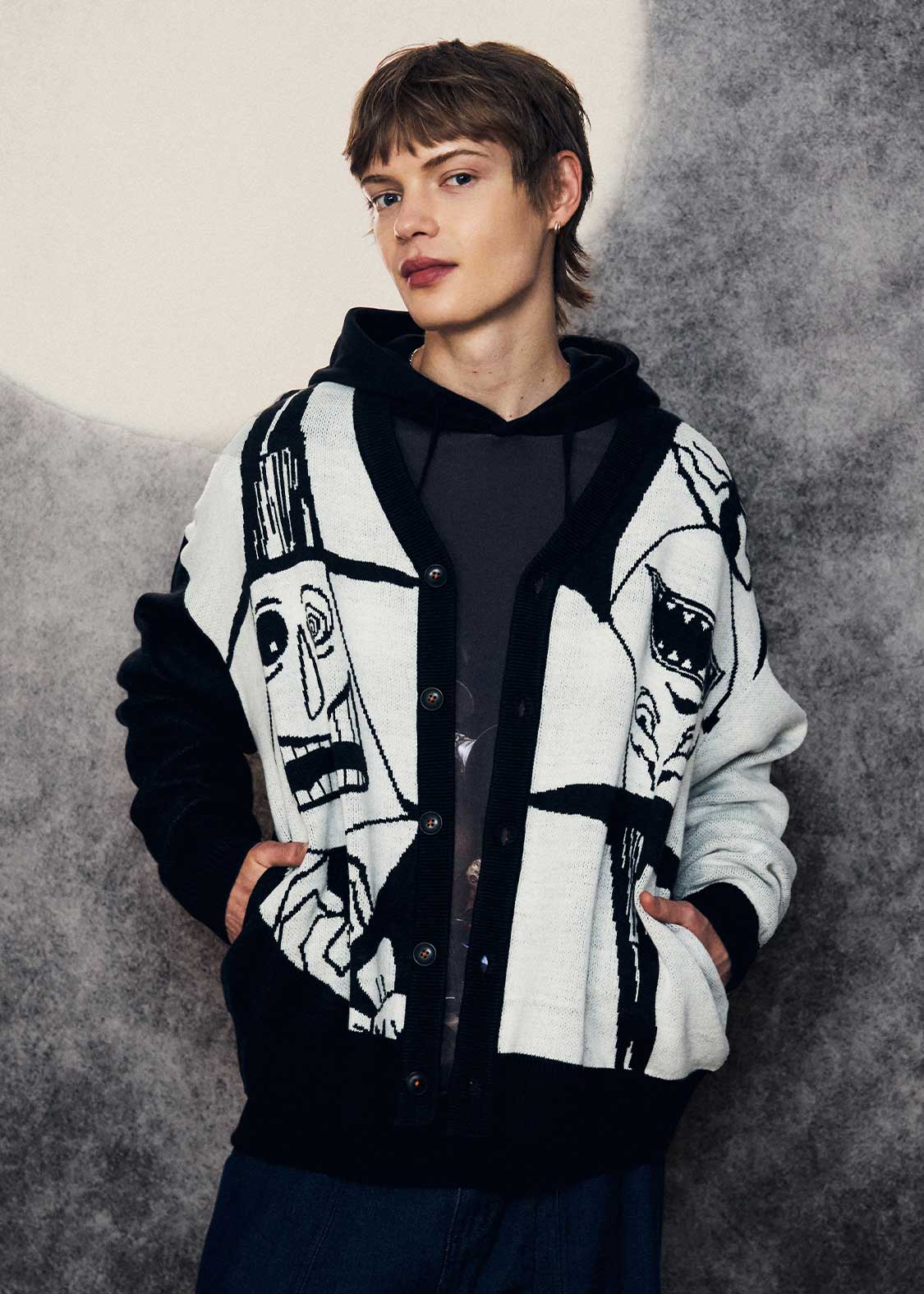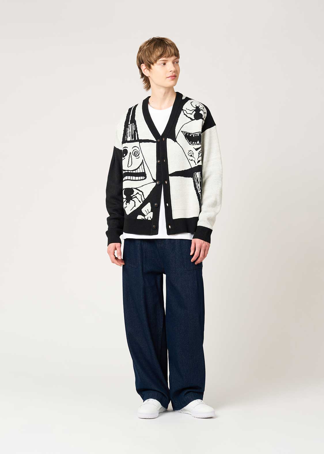 ・ジャカードで柄を表現した、Vネックのニットカーディガン。