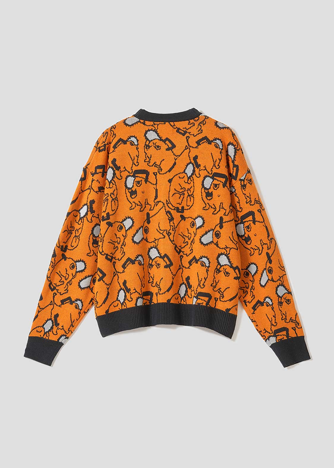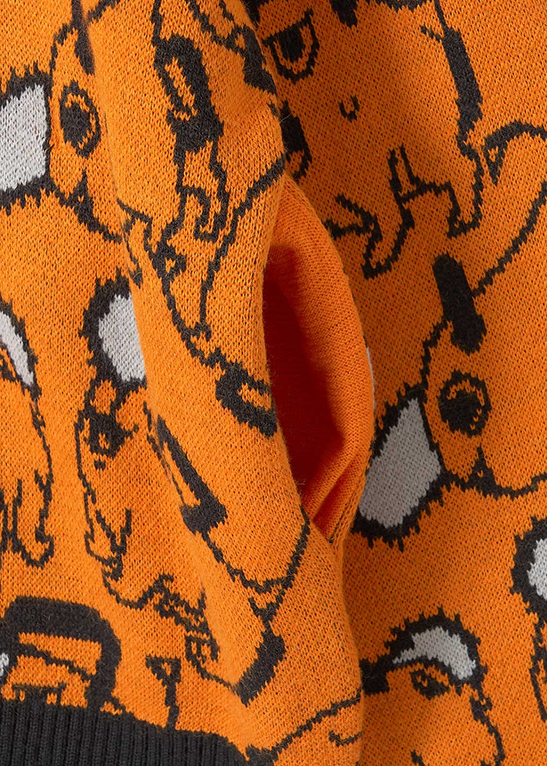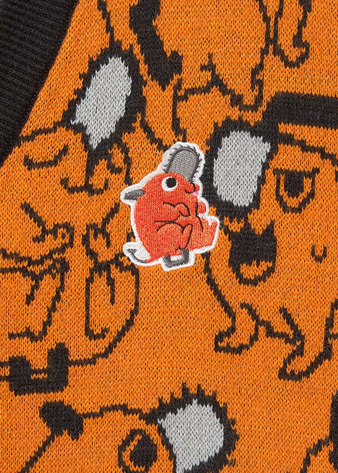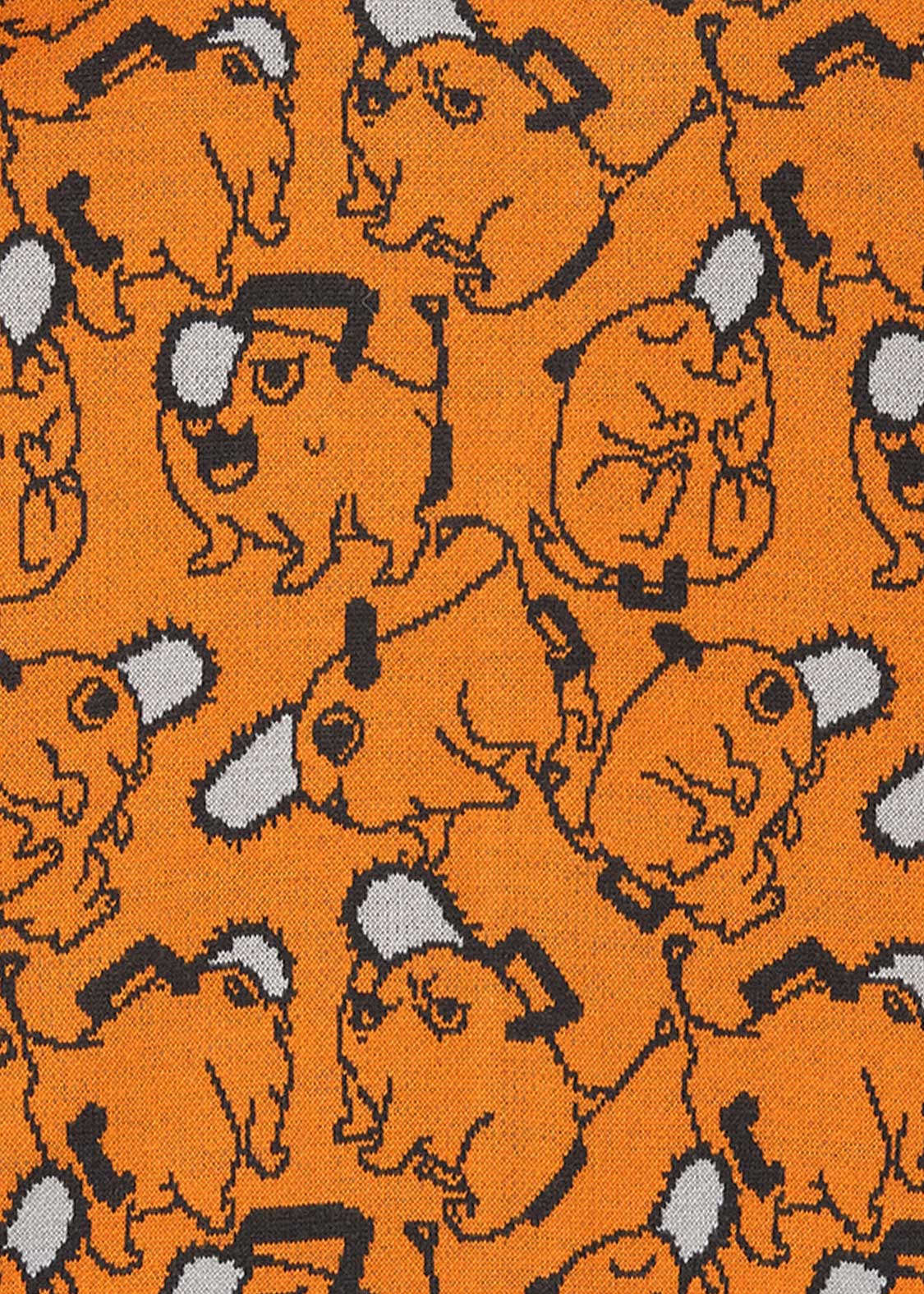 ポチタのバラエティ豊かな表情やポーズのパターン柄をジャガードで表現しました。胸元にはポチタのワッペンをあしらったポチタづくしのデザインです。