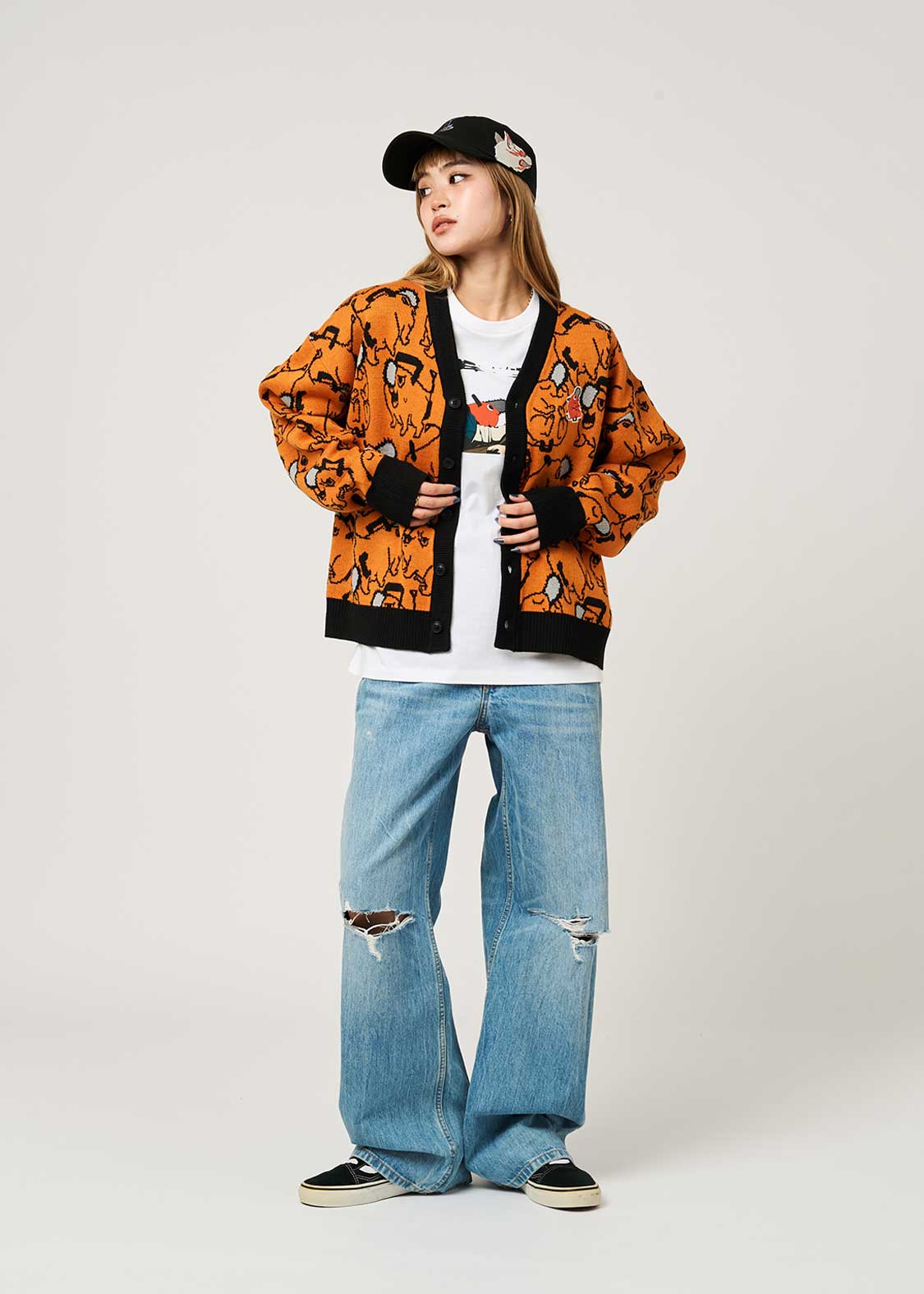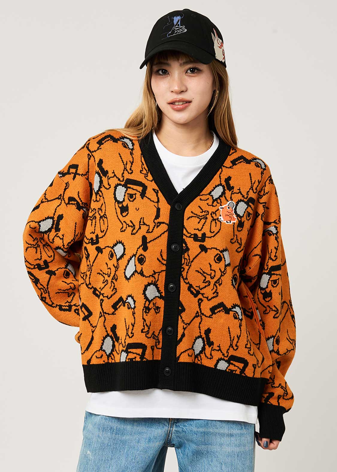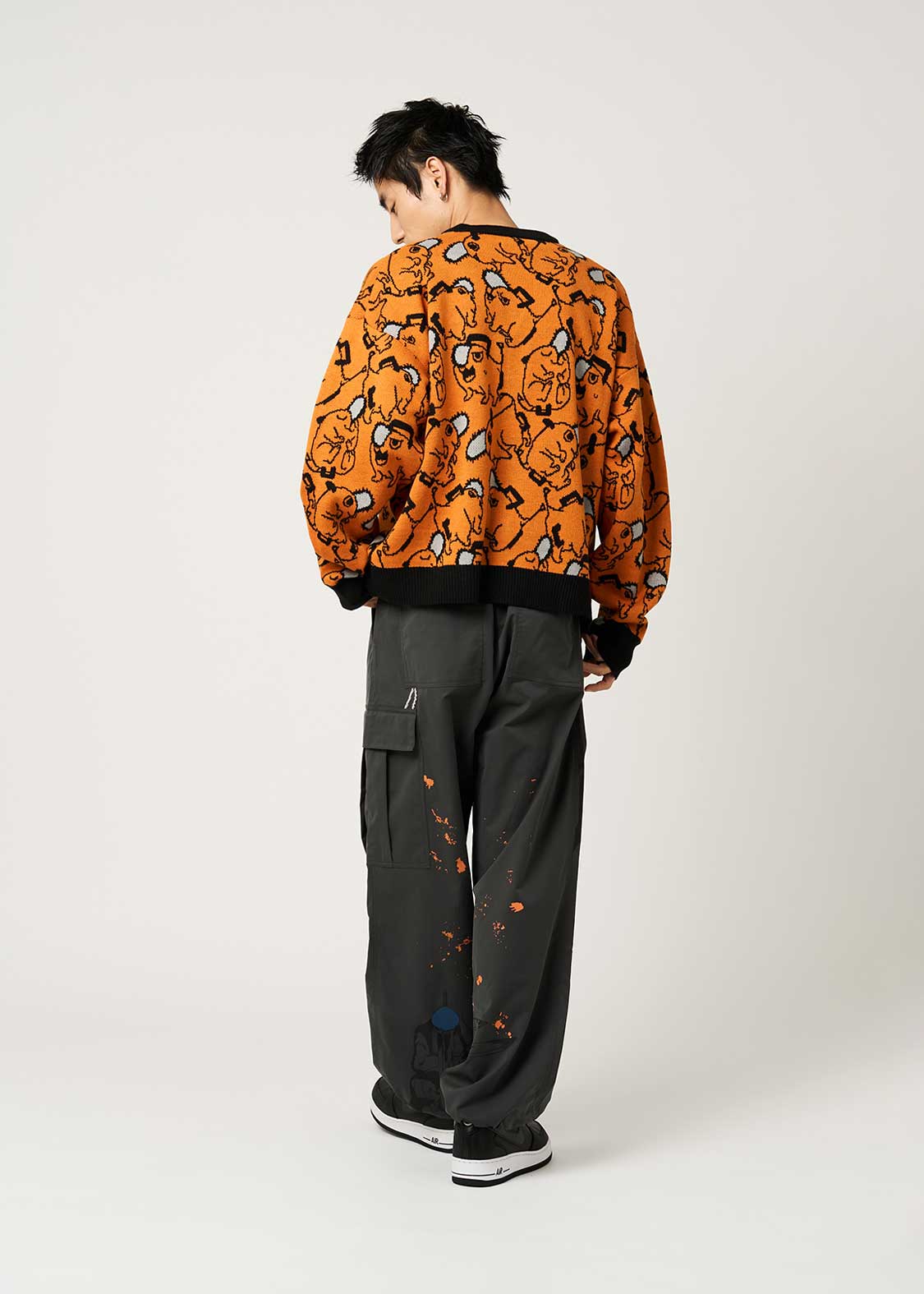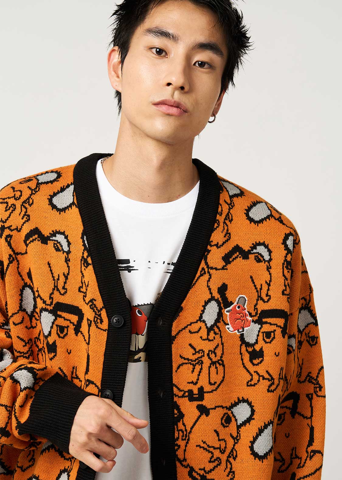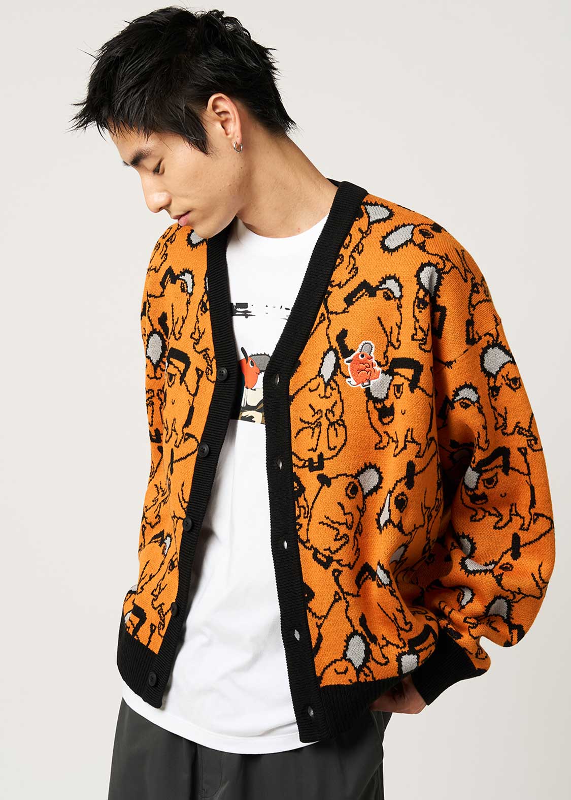 ポチタのバラエティ豊かな表情やポーズのパターン柄をジャガードで表現しました。胸元にはポチタのワッペンをあしらったポチタづくしのデザインです。
