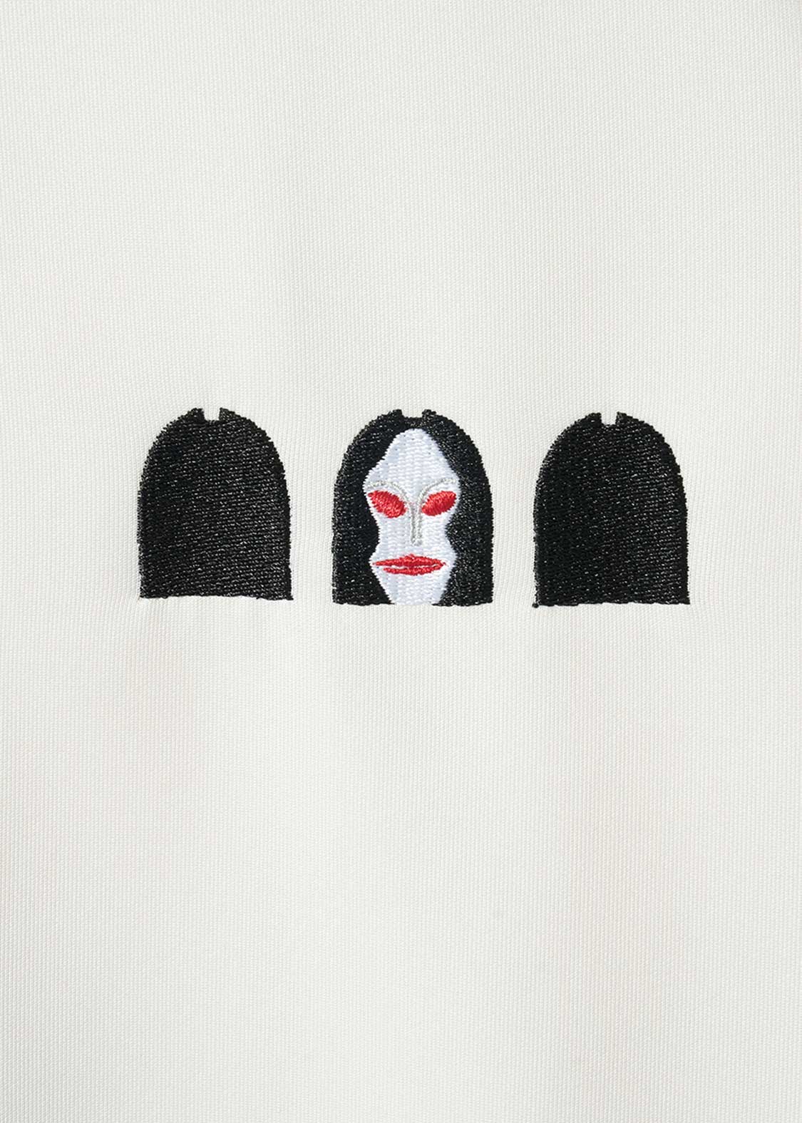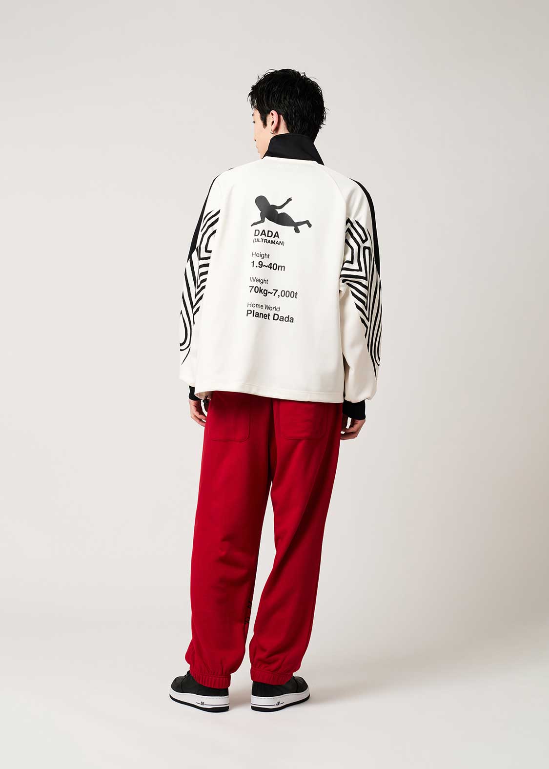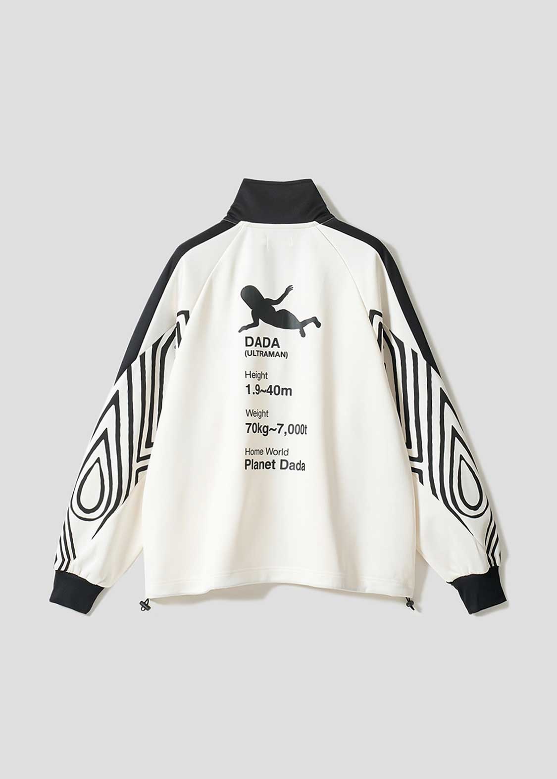 胸元にはダダの顔を刺繍であしらい、袖には体の模様をプリントで表現しました。バックには、横たわるダダのシルエットとプロフィールをプリントした遊び心あふれるデザインです。