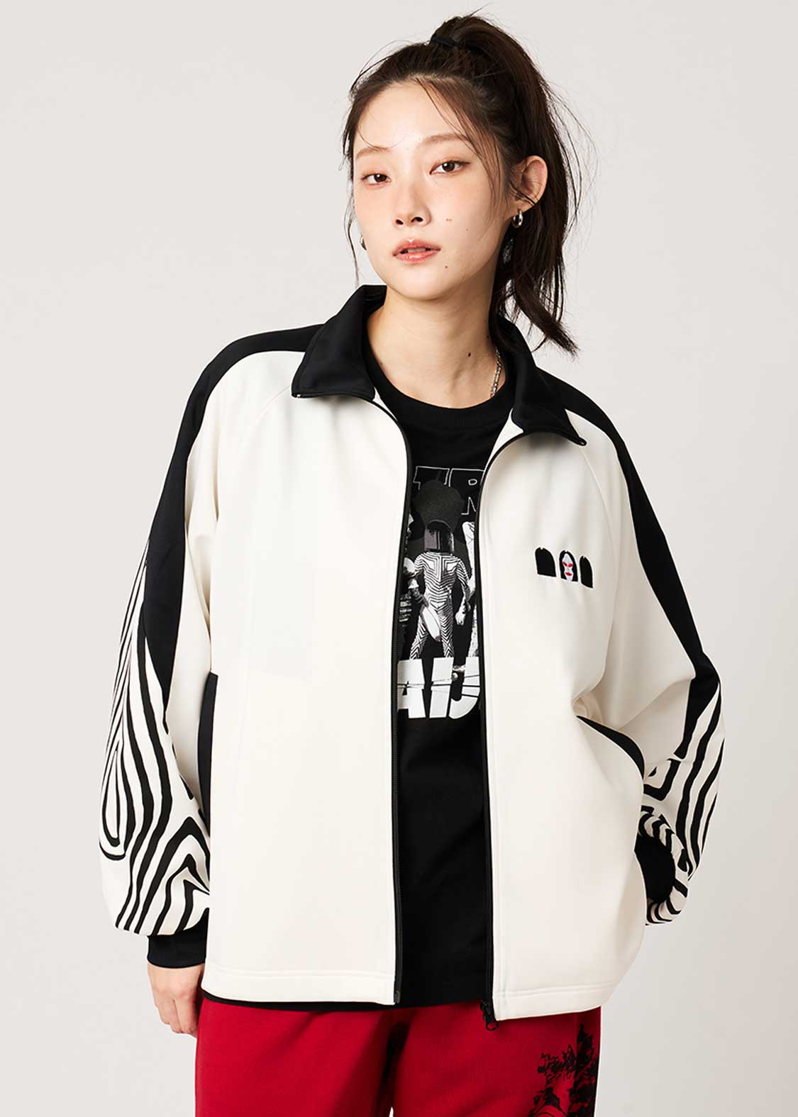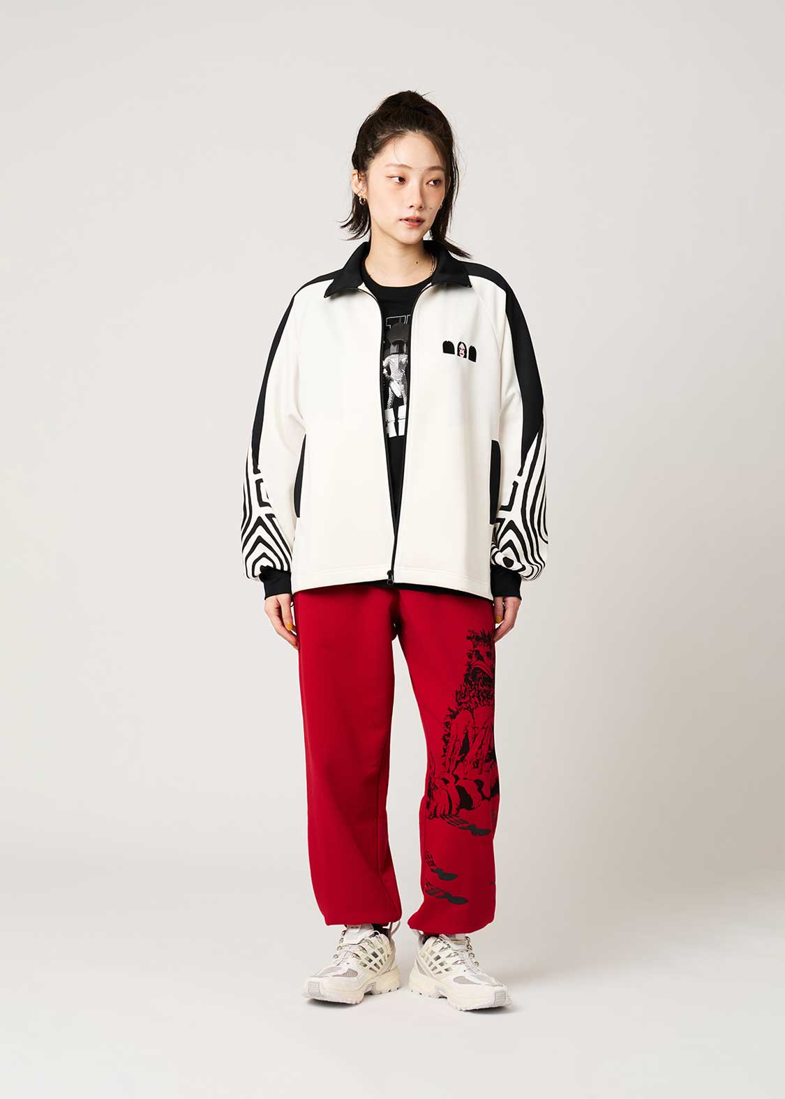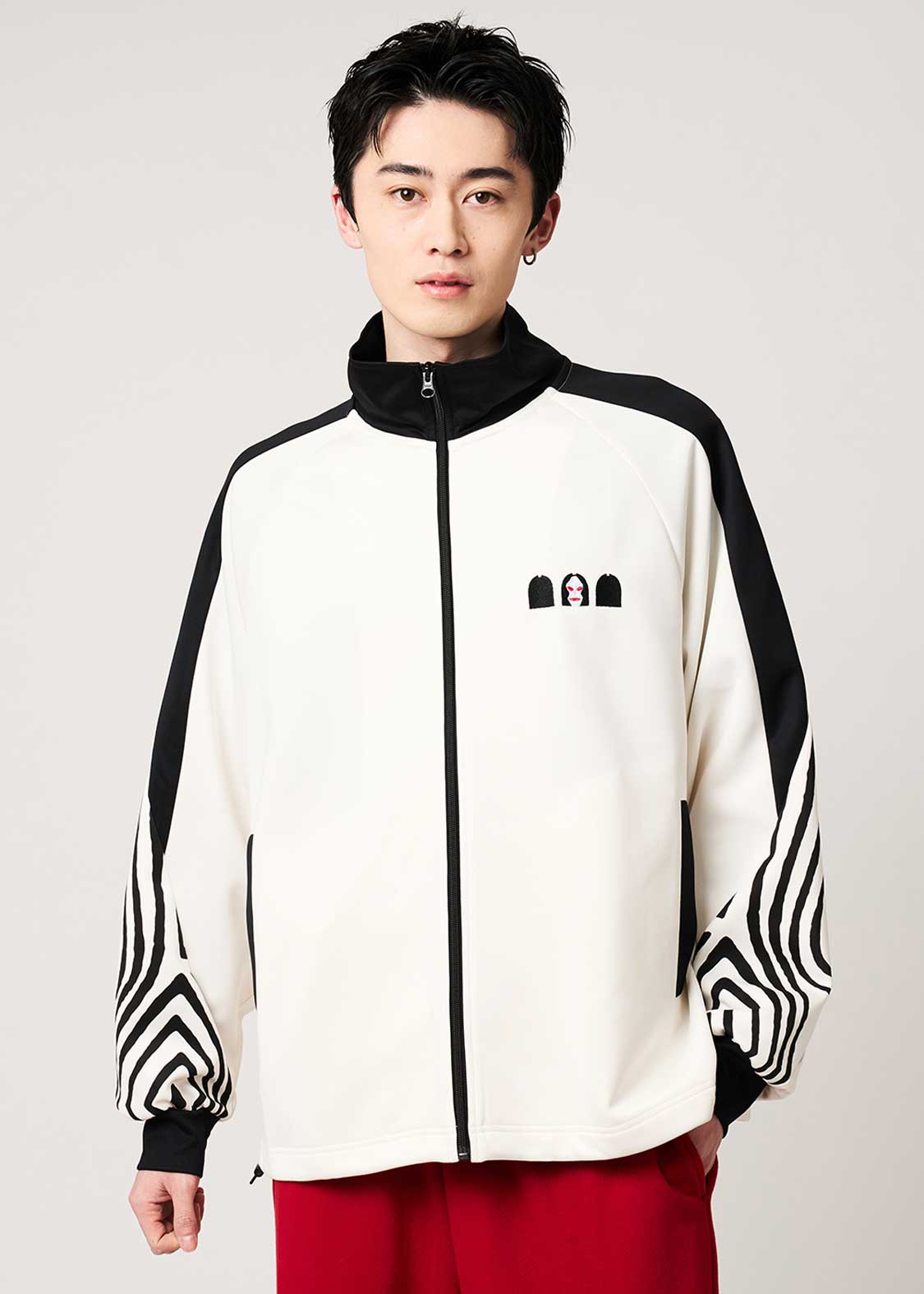 胸元にはダダの顔を刺繍であしらい、袖には体の模様をプリントで表現しました。バックには、横たわるダダのシルエットとプロフィールをプリントした遊び心あふれるデザインです。