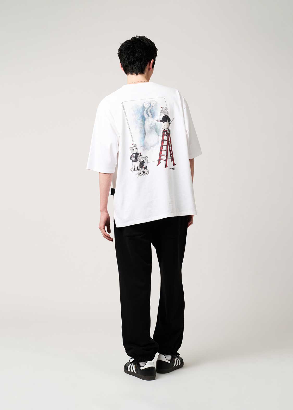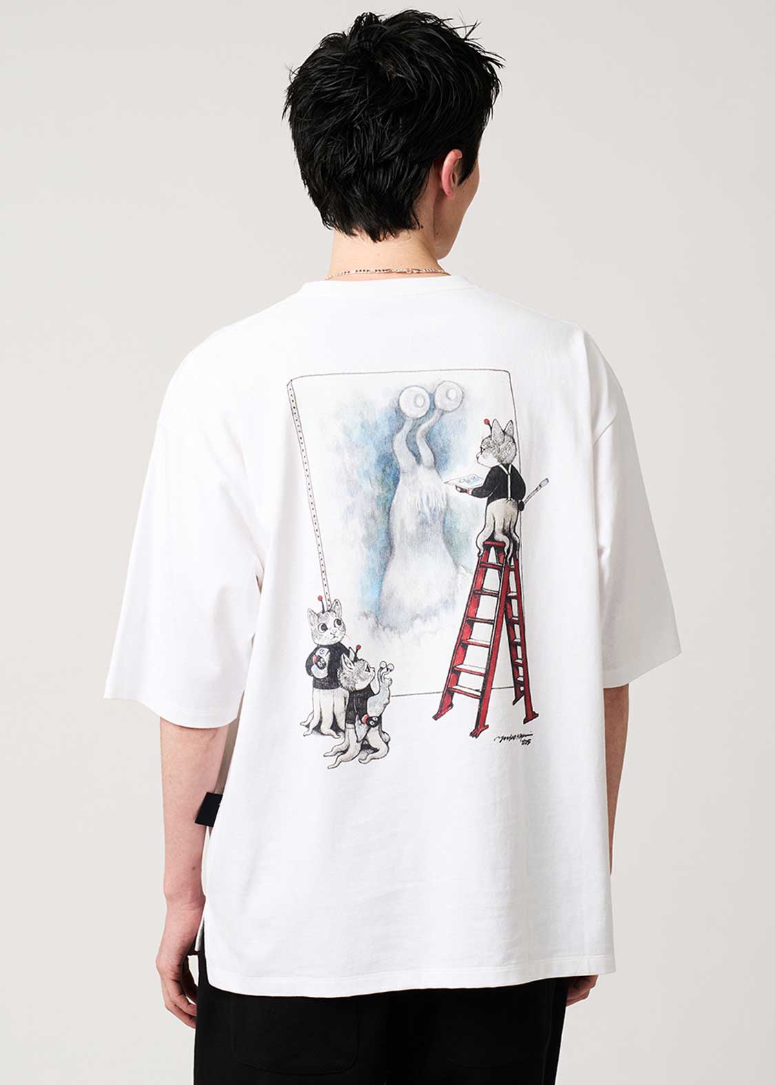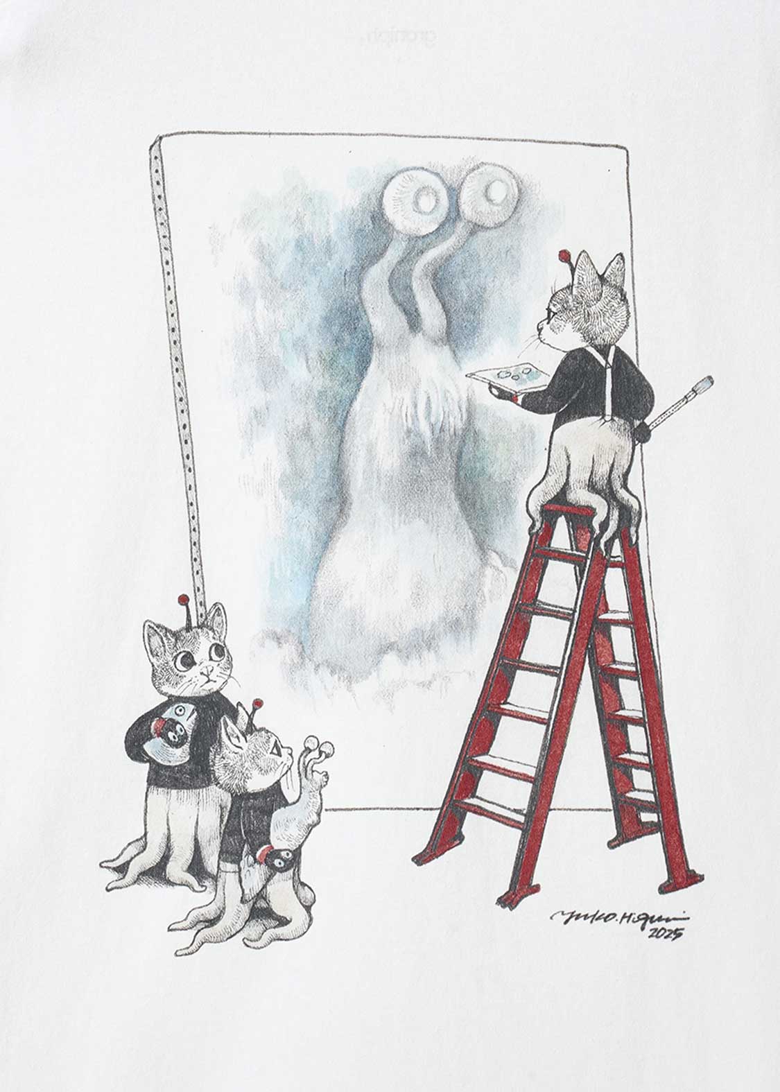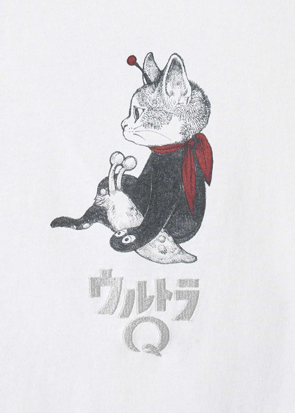 画家・ヒグチユウコが描く特別なコラボレーションデザイン。フロントにはナメゴンのフィギュアをそっと抱えるギュスターヴくんを描き、『ウルトラQ』のロゴを刺繍であしらいました。バックには、大きなキャンバスにナメゴンを描くギュスターヴくん1号と、その様子を見守っているギュスターヴくんたちの姿をプリント。添えられた『ウルトラQ』の織りネームもさりげないアクセントになっています。