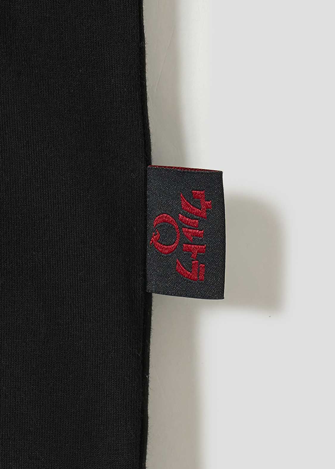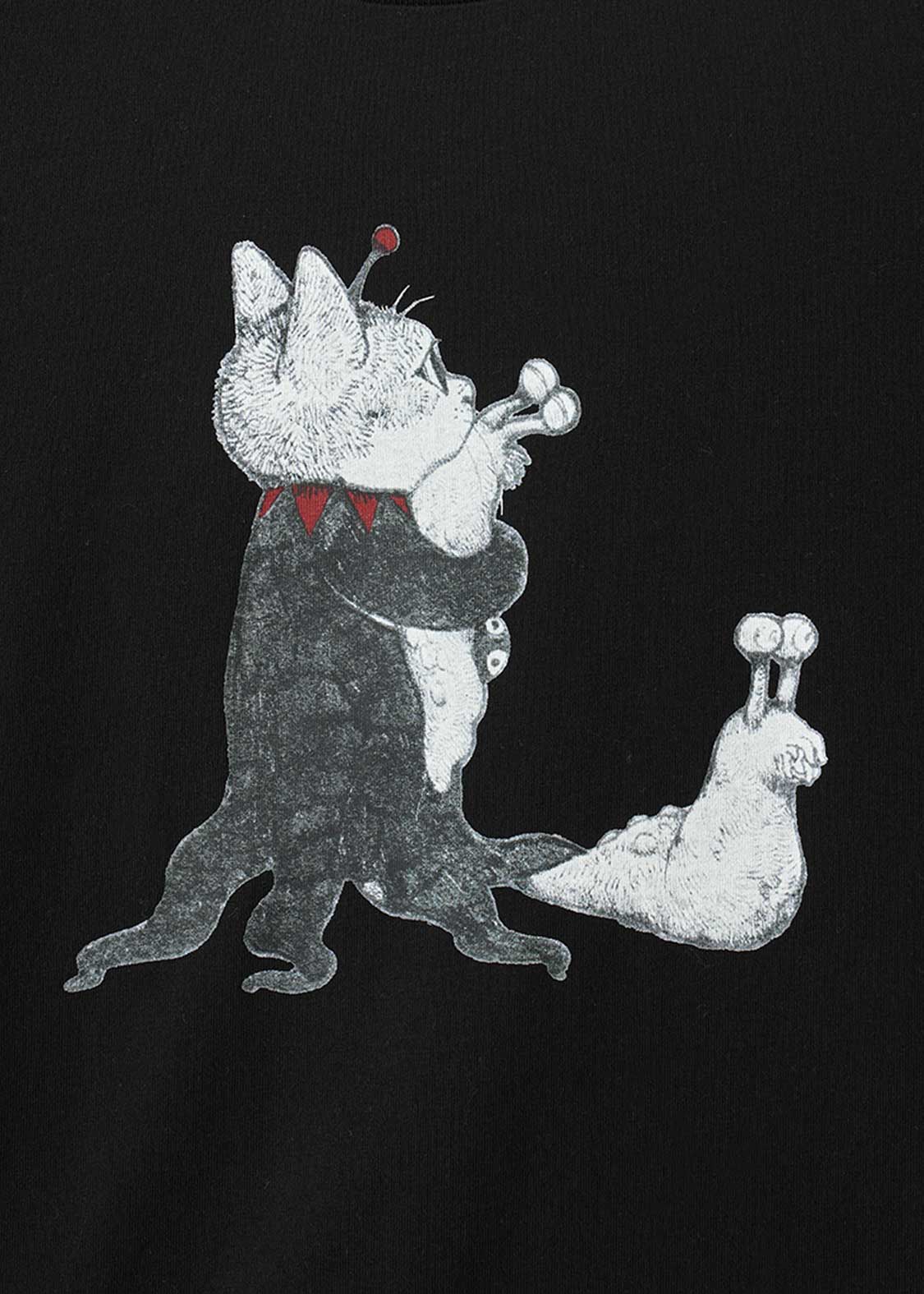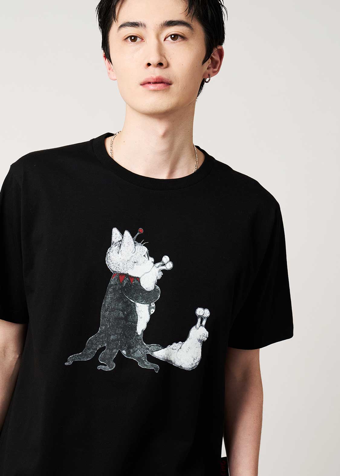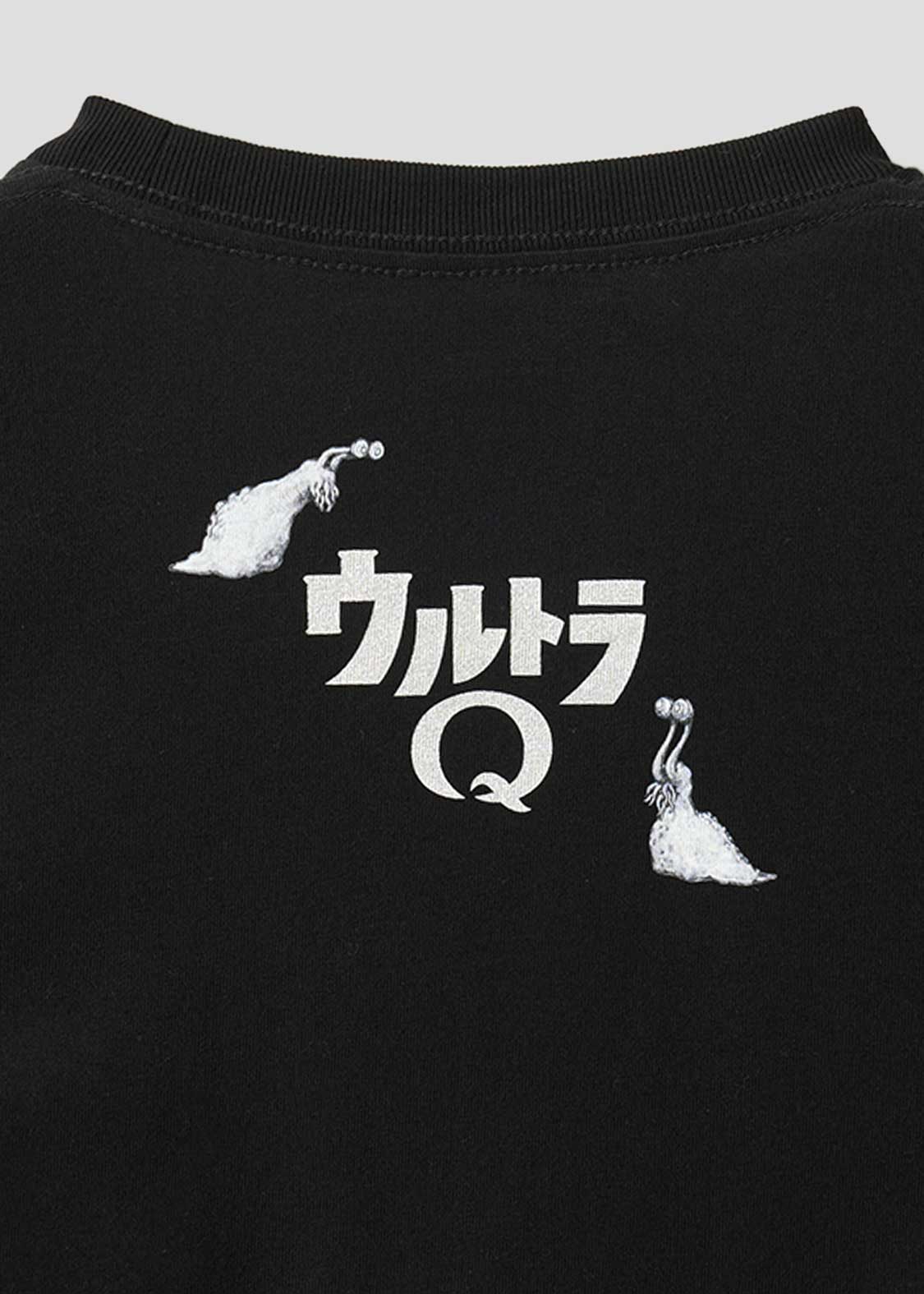 画家・ヒグチユウコが描く特別なコラボレーションデザイン。フロントにはナメゴンのフィギュアを抱えるギュスターヴくんと、その隣に並ぶナメゴンをプリントで表現。バックには『ウルトラQ』のロゴをアルミ粉プリントであしらい、まわりにはナメゴンを描いています。添えられた『ウルトラQ』の織りネームもさりげないアクセントになっています。