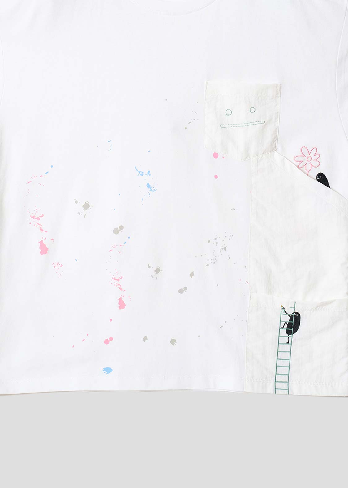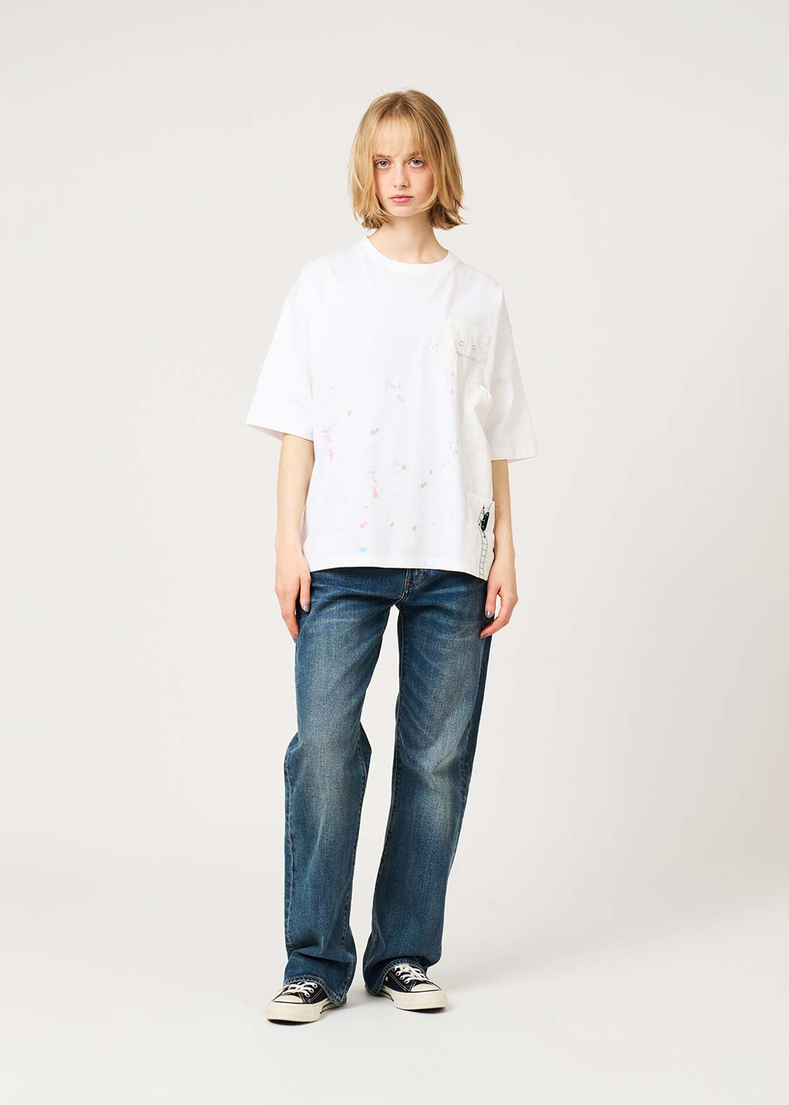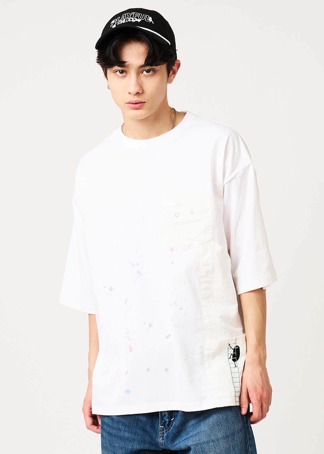 ・ナイロンワッシャー生地を使用したポケットや、ペイントが飛び散ったようなデザインがアクセントになっています。