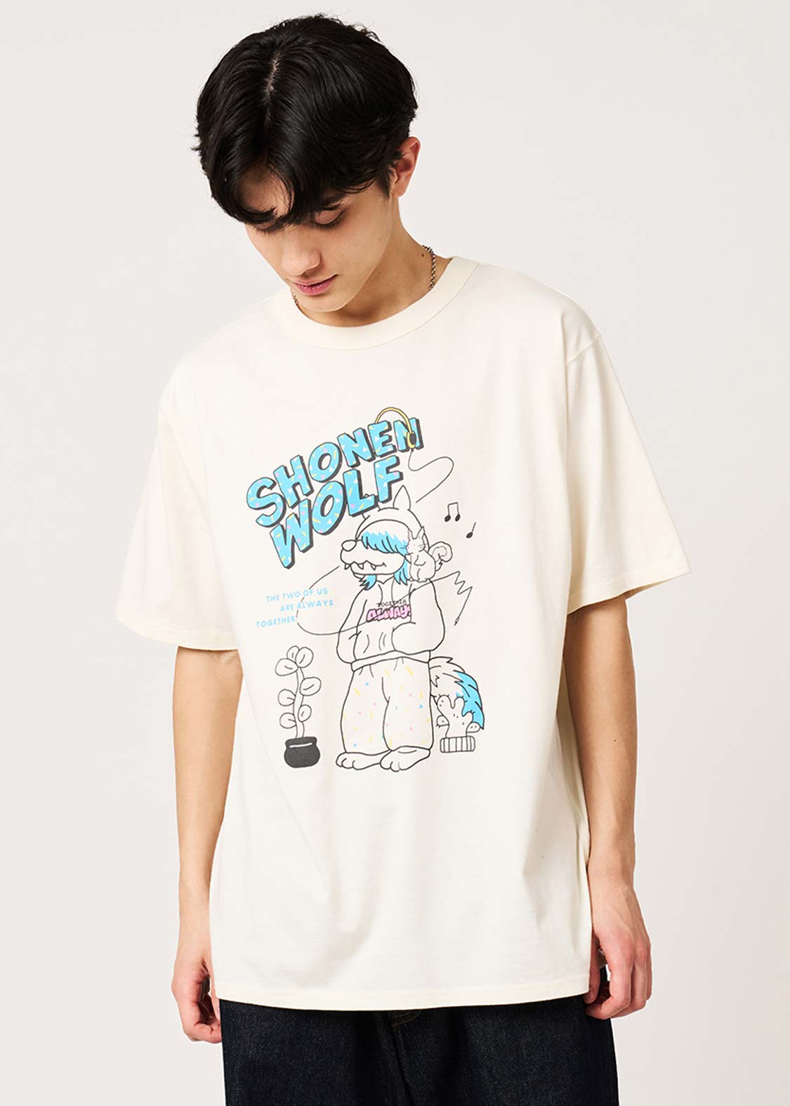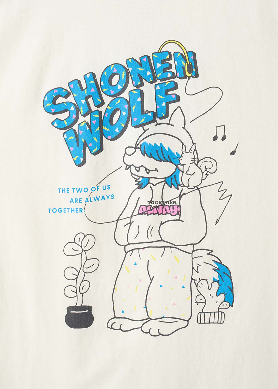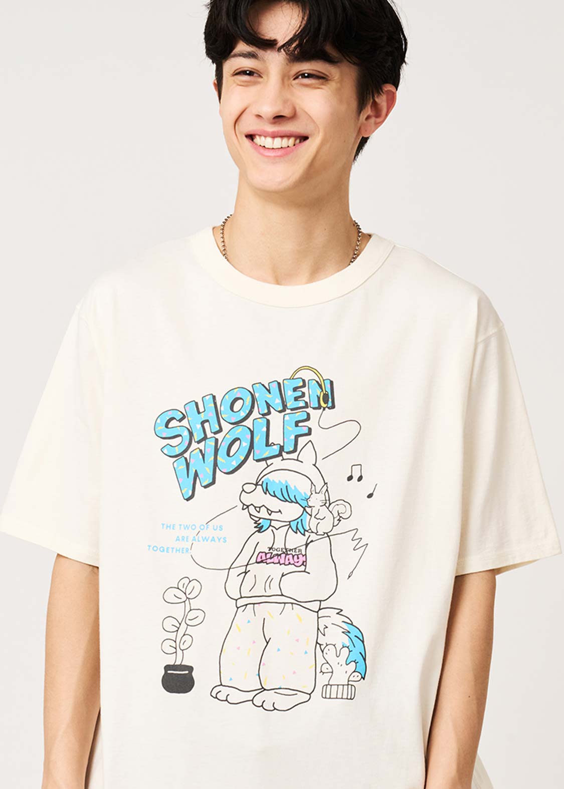 幼い頃公園で出会った大親友のリスくんと、いつも一緒の心優しいオオカミ少年。インナーカラーをいれたヘアスタイルが特徴です。ポップなイラストタッチが魅力のデザイン。