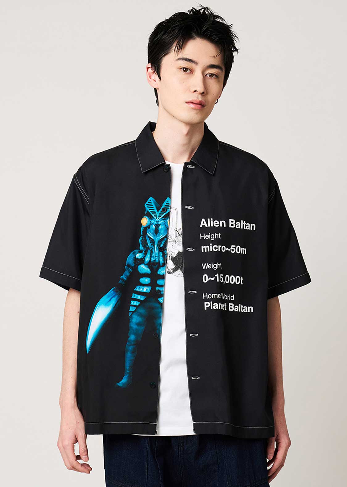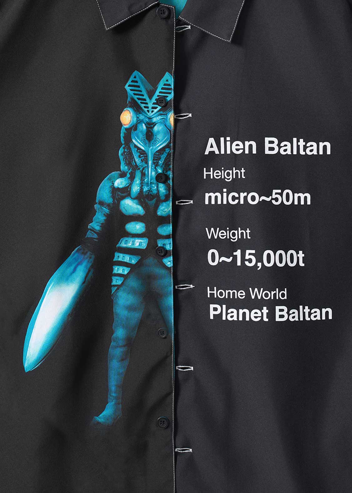 前立ての下からバルタン星人が覗くように半分だけ姿を見せ、その横にはプロフィールをプリントした遊び心あふれるデザイン。バックには、半分だけ見える後ろ姿と特徴的な声「フォッフォッ」をプリントしています。