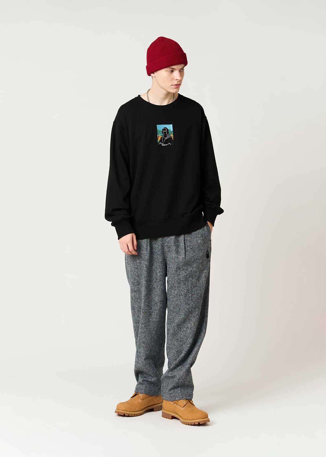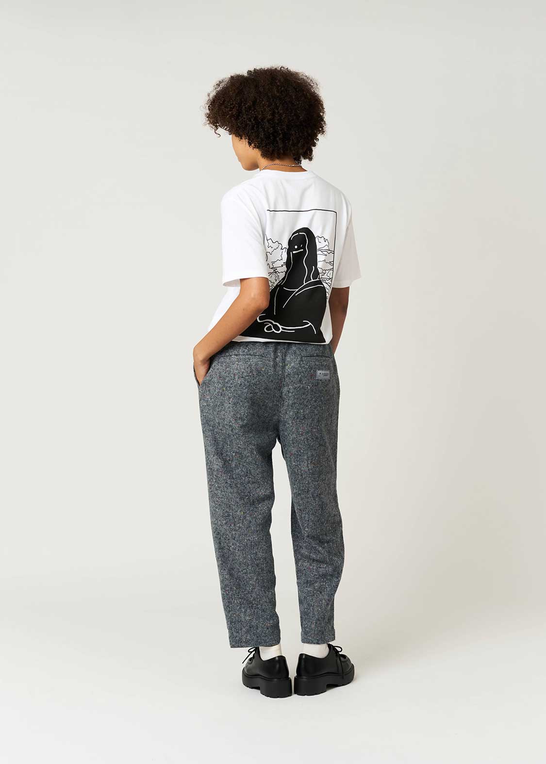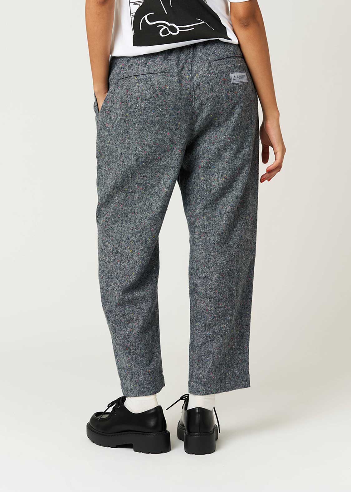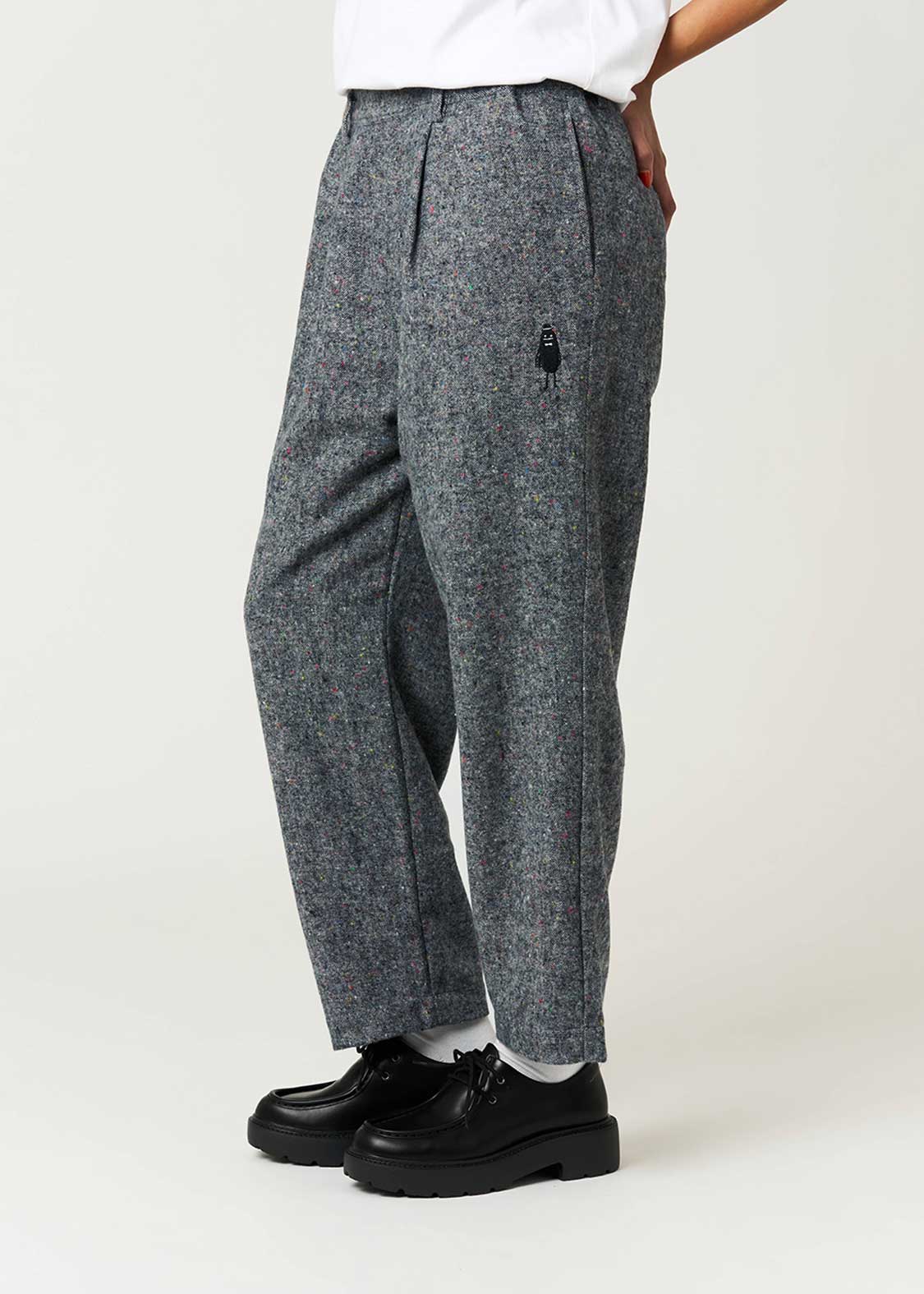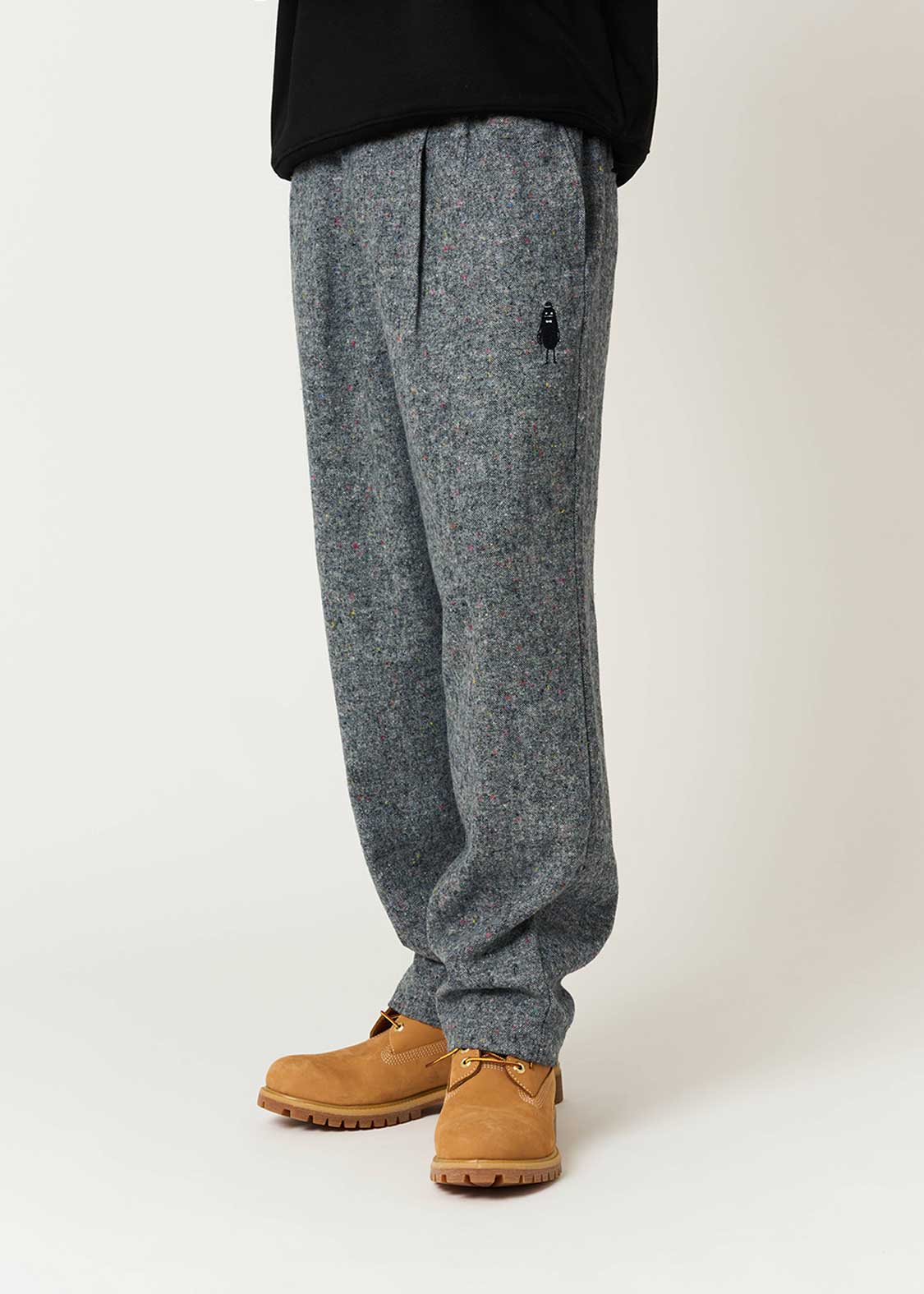 ・シックなベース地に小さいカラフルなネップが入っている素材を使用したパンツ。