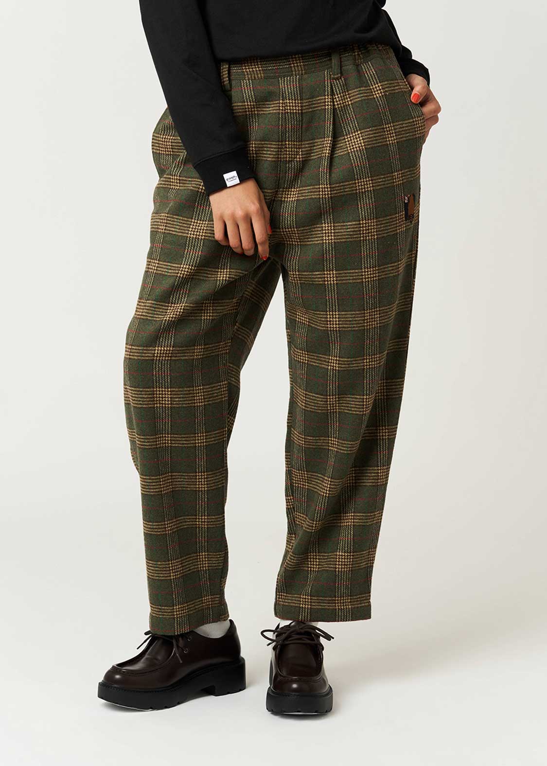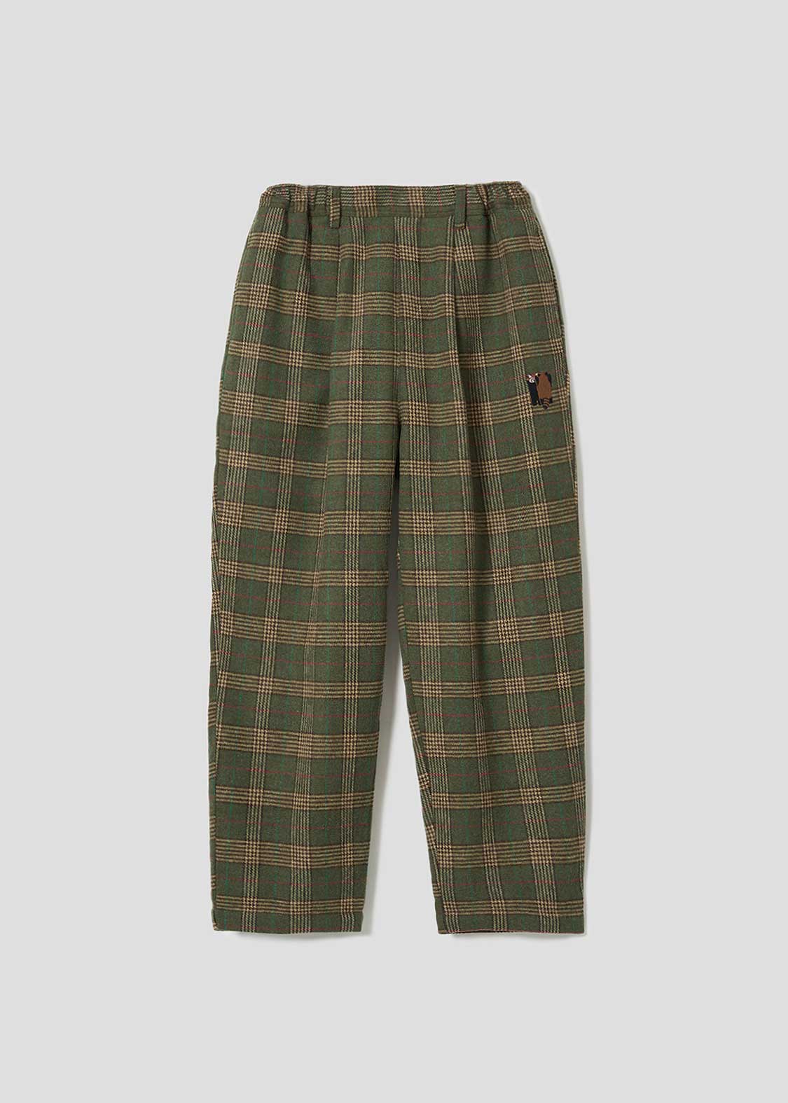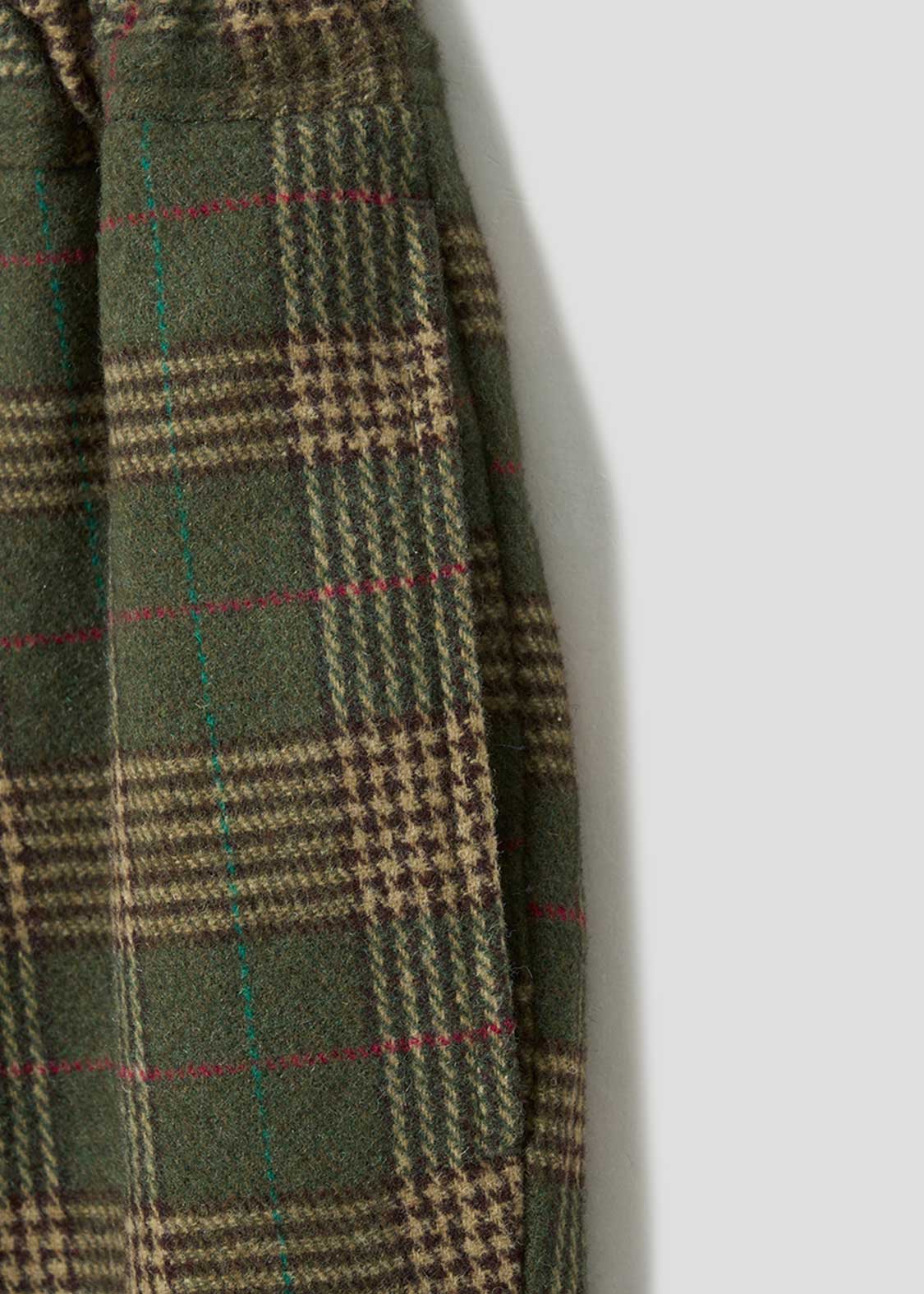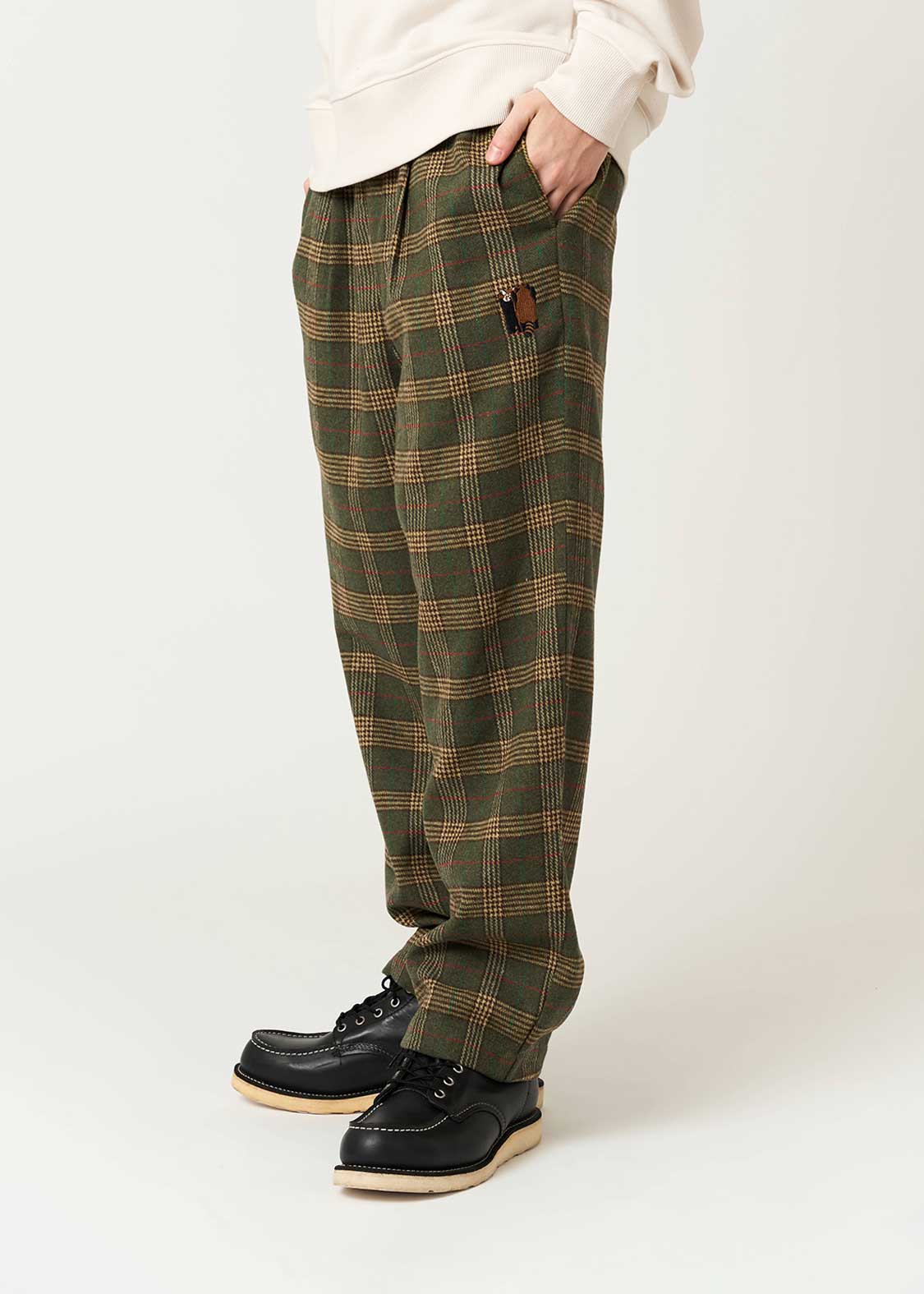 ・オリジナルのチェックを編み立てた素材を使用したパンツ。