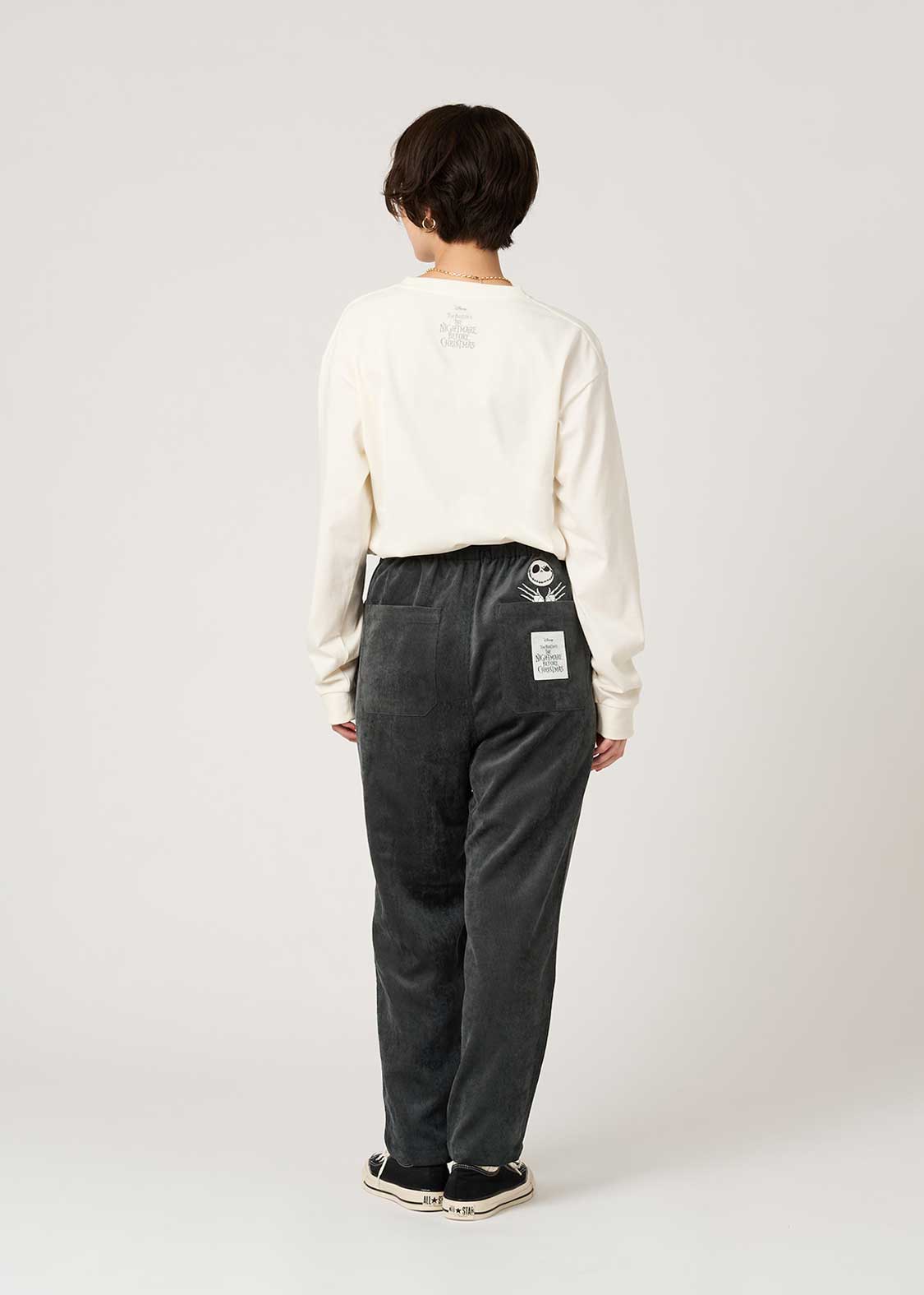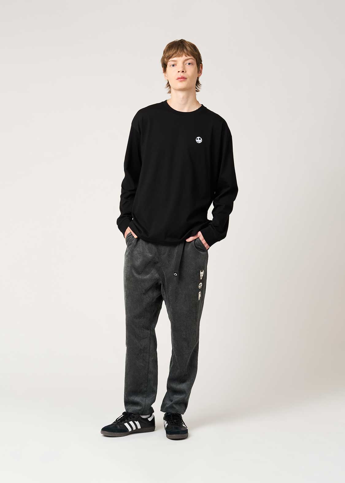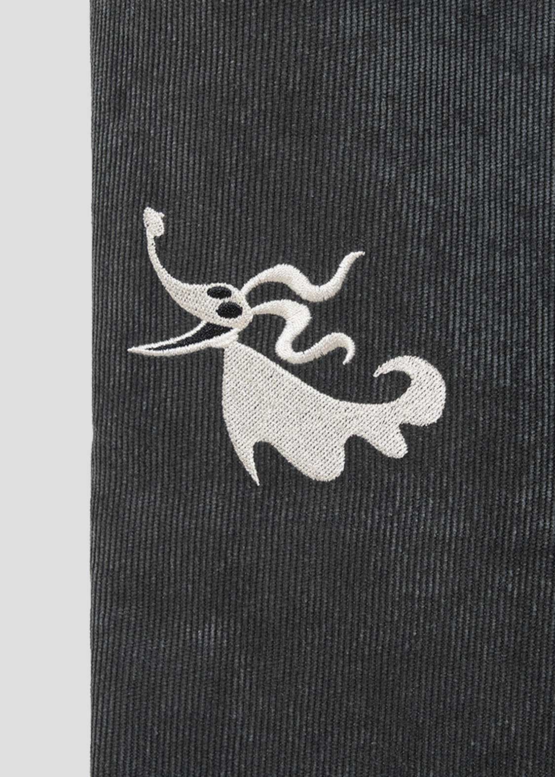 幽霊犬ゼロ、ウギー・ブギー、ロック、ショック、バレルをフロントにあしらい、ジャックをバックポケットから覗くように刺繍で表現したデザイン。ベルトの先にはウギー・ブギーの織りネームを、バックポケットにはロゴの織りネームを施しています。