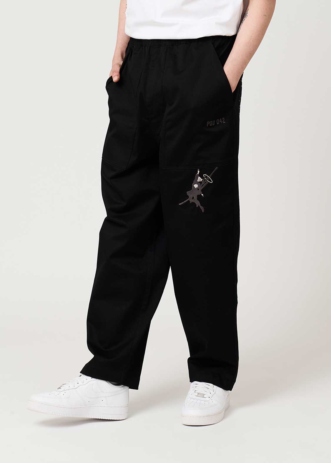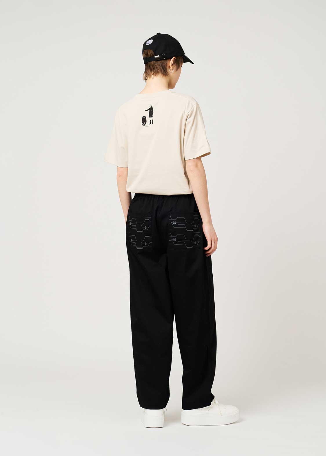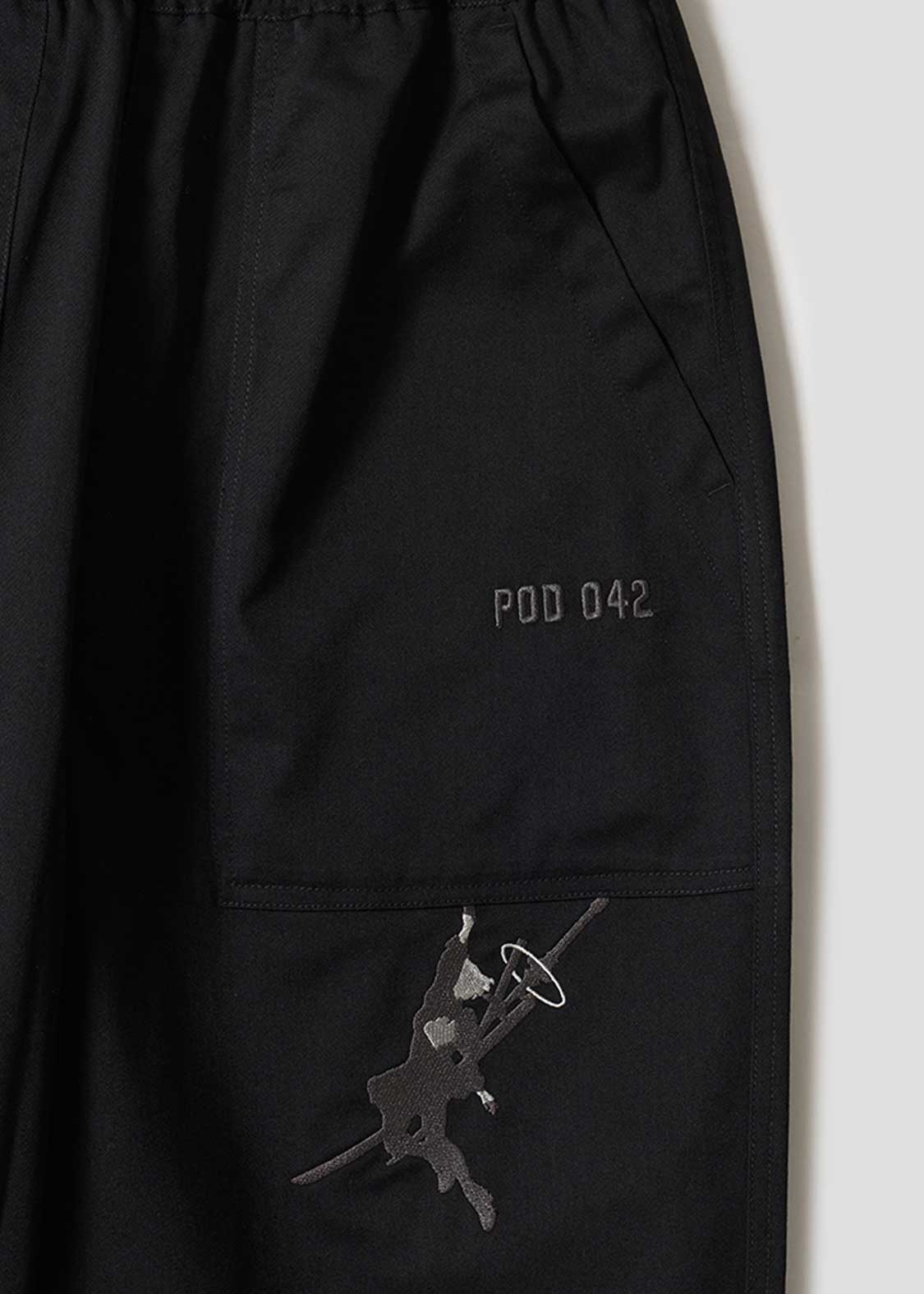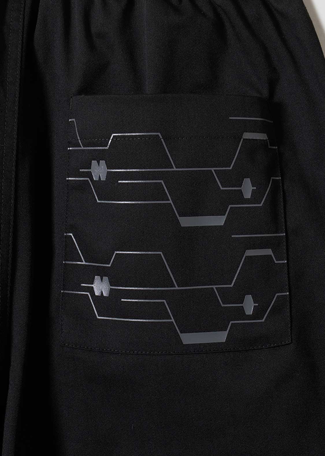 フロントポケットをポッドに見立て、ぶら下がり移動する2Bの後ろ姿を刺繍しました。バックにはブラックボックスをイメージしたポケットがデザインされています。大爆発にはご注意ください・・。