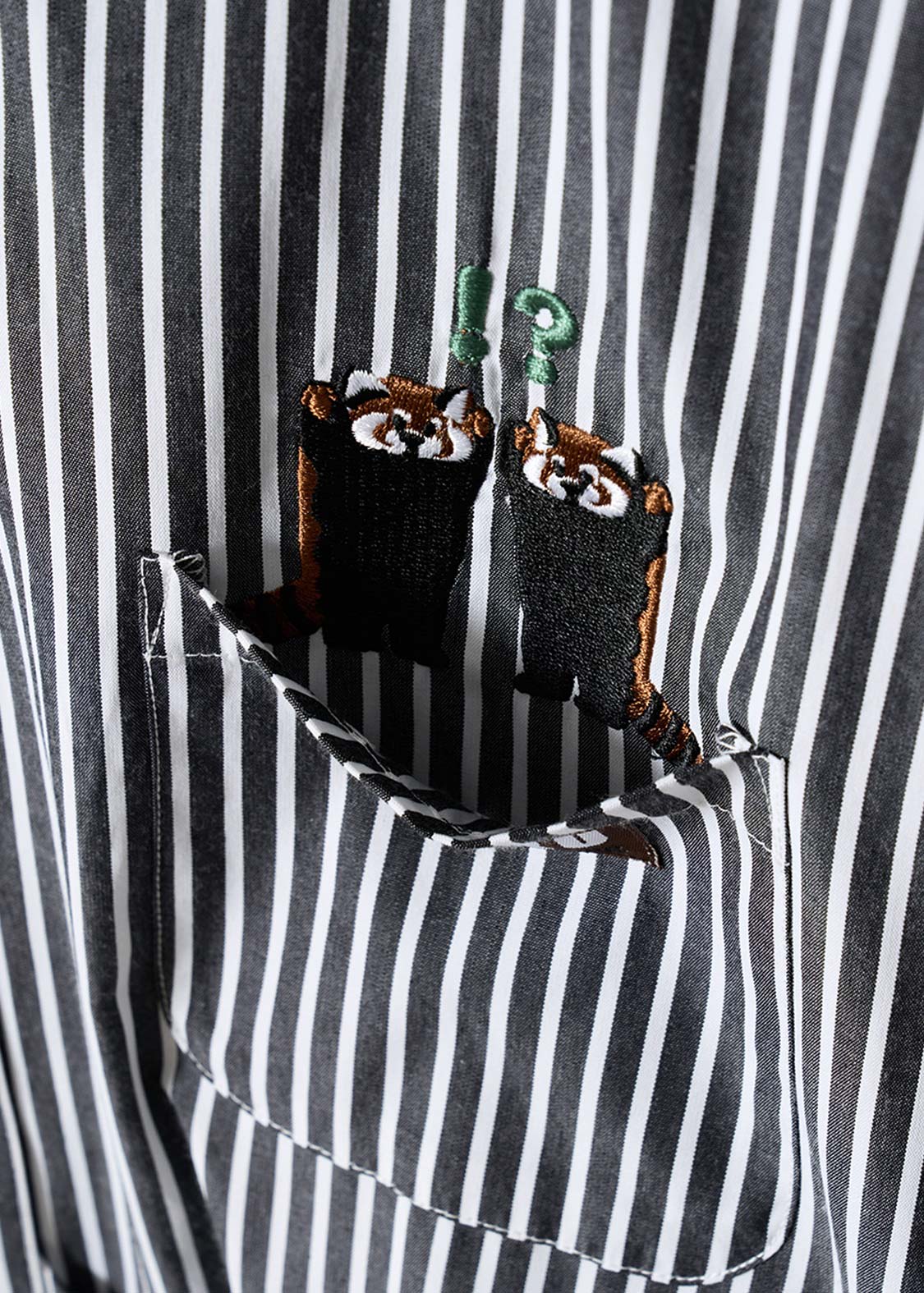 レッサーパンダの「?」と「!」の表情を、遊び心たっぷりにデザイン。ちょっとしたリアクションを切り取った、!?マークがアクセントのグラフィックです。