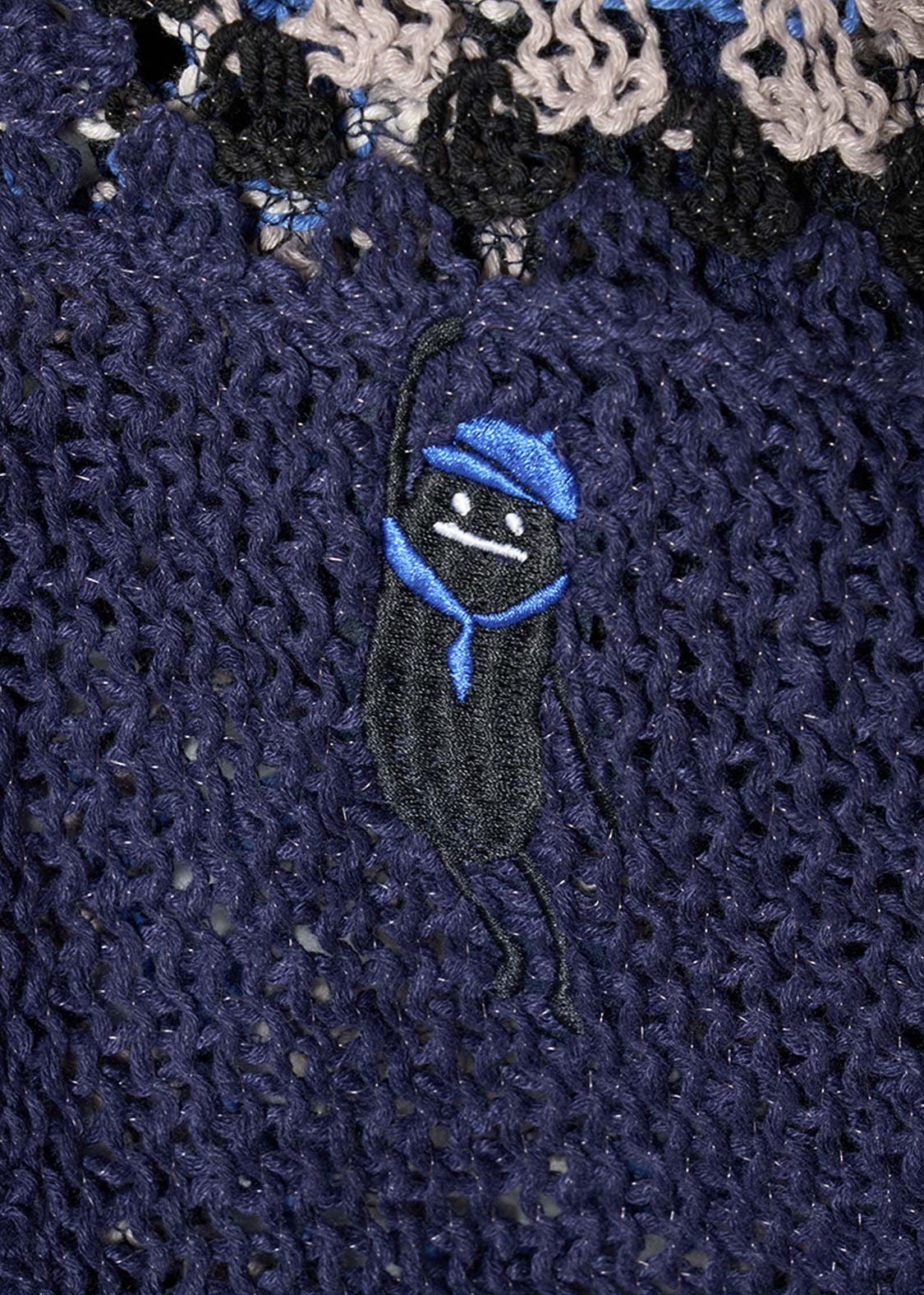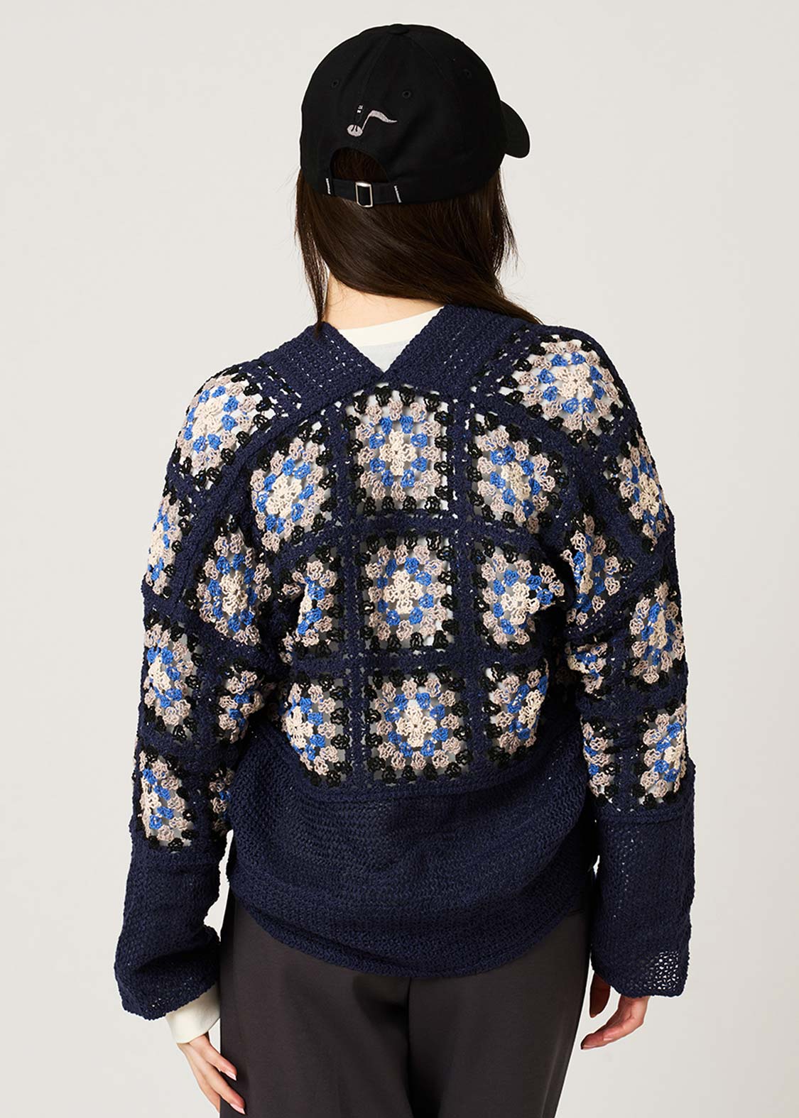 ・カラフルなクロシェ風の編み地が目を惹く、ショート丈のカーディガンです。