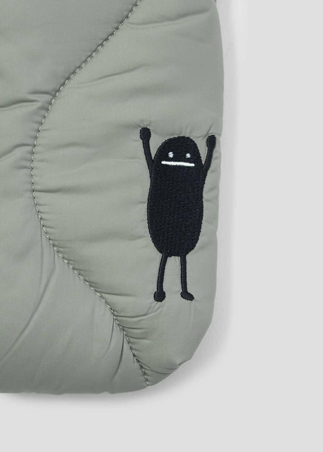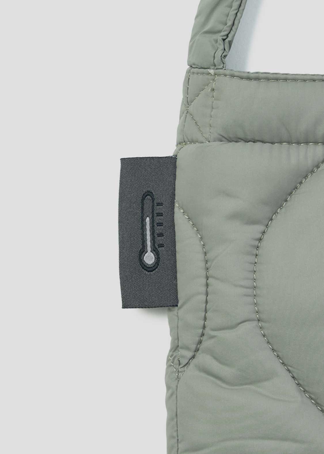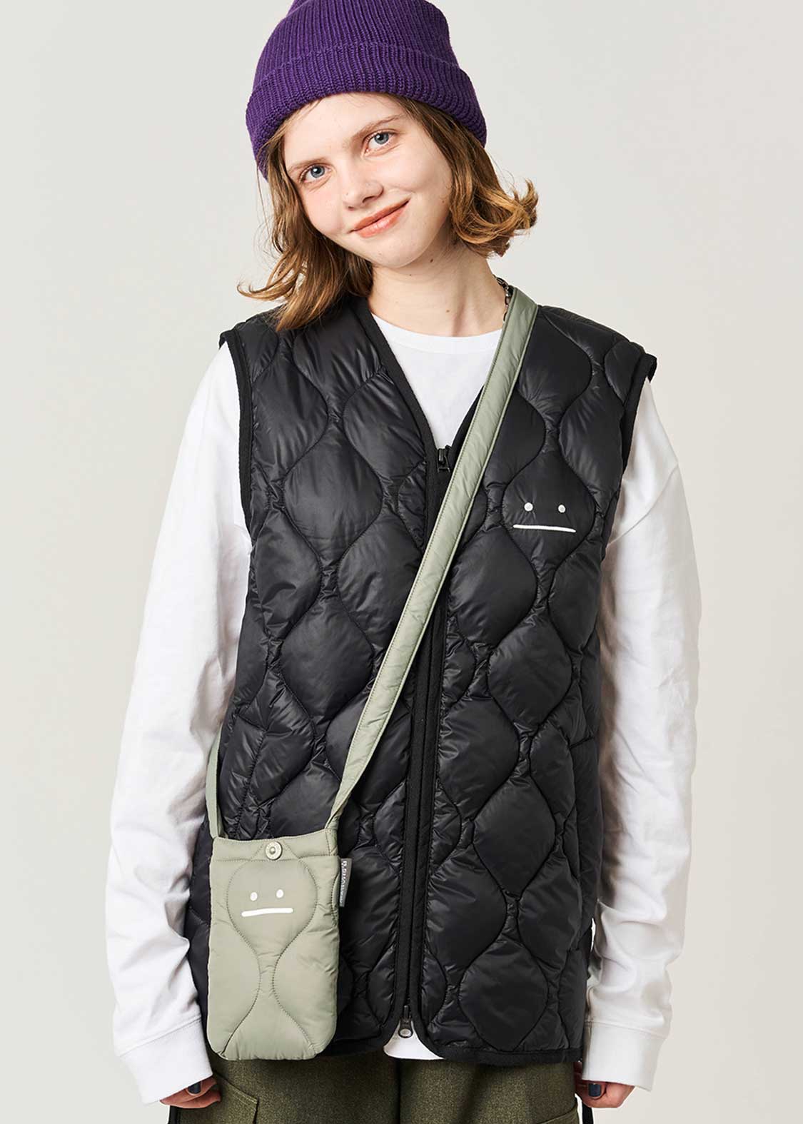 表地 - ナイロン 100% / 中綿 (身頃部分) - ダウン 95% フェザー 5% / 中綿 (ストラップ部分) - ポリエステル 100% / 裏地 - ナイロン 100% / 刺繍糸(上糸) - レーヨン 100% / 刺繍糸(下糸) - ポリエステル 100%