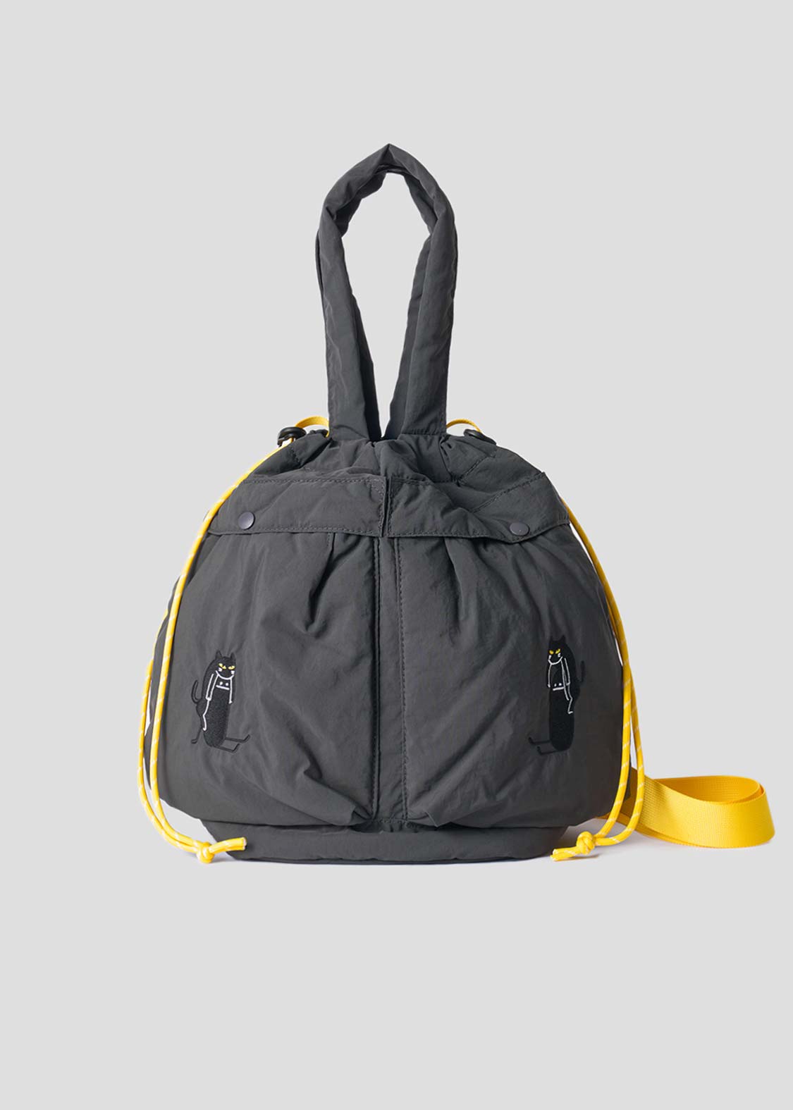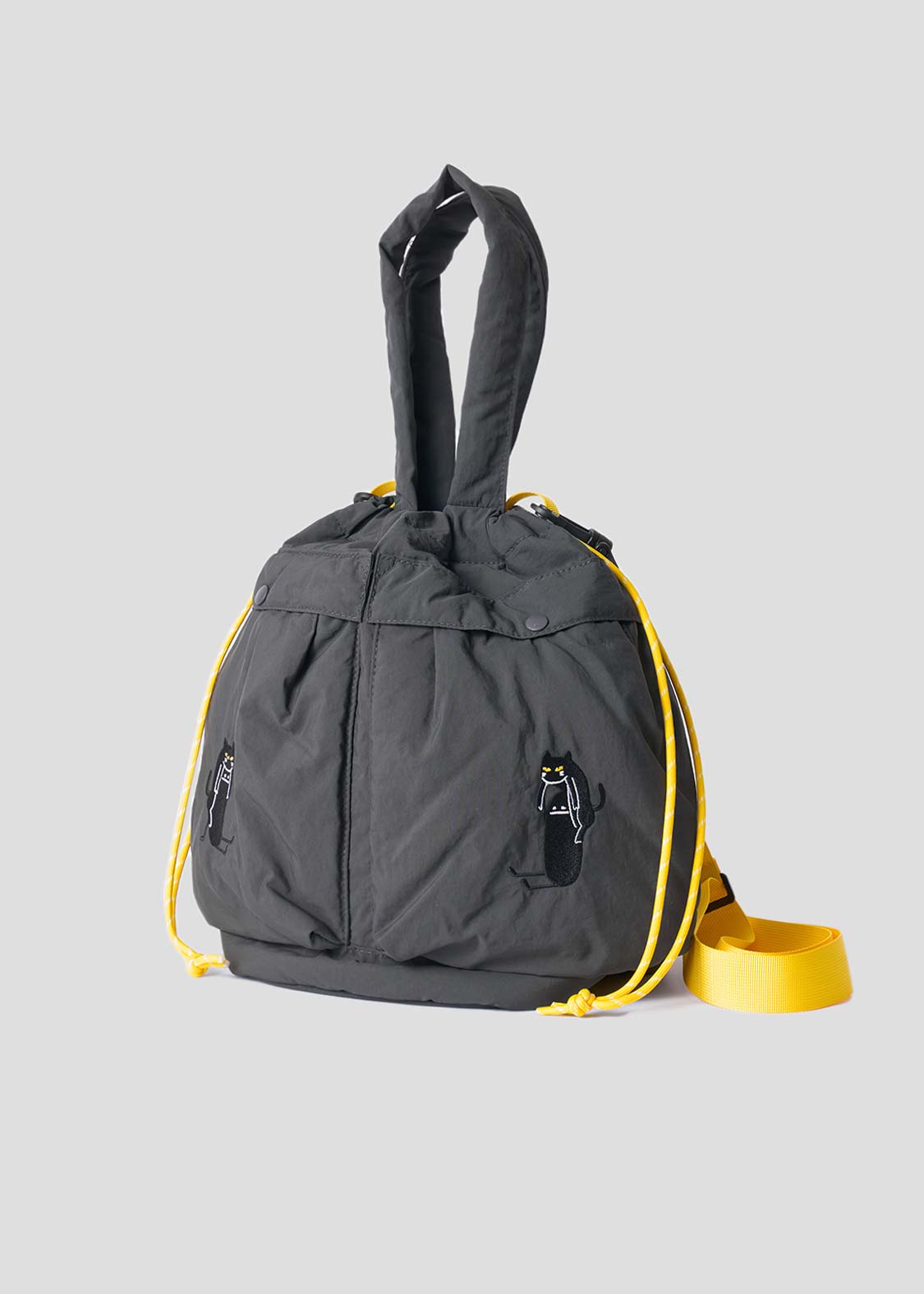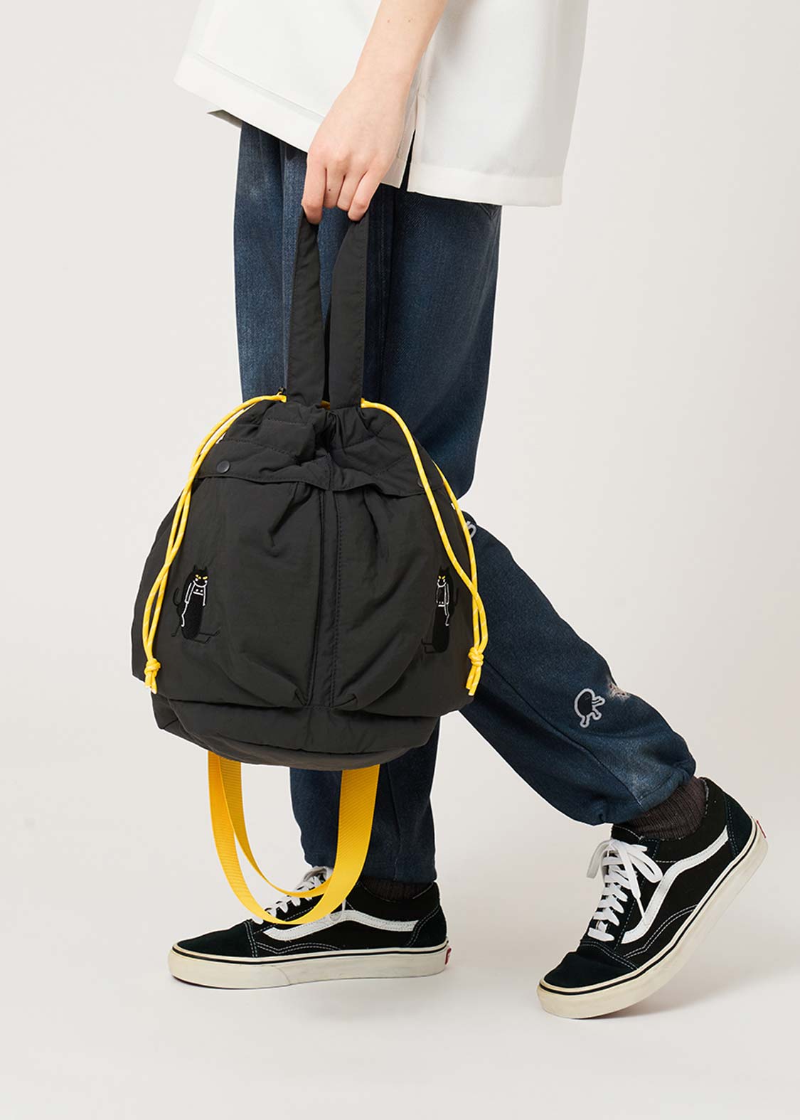 ・光沢感のあるポリエステル生地を使用した巾着バッグ。