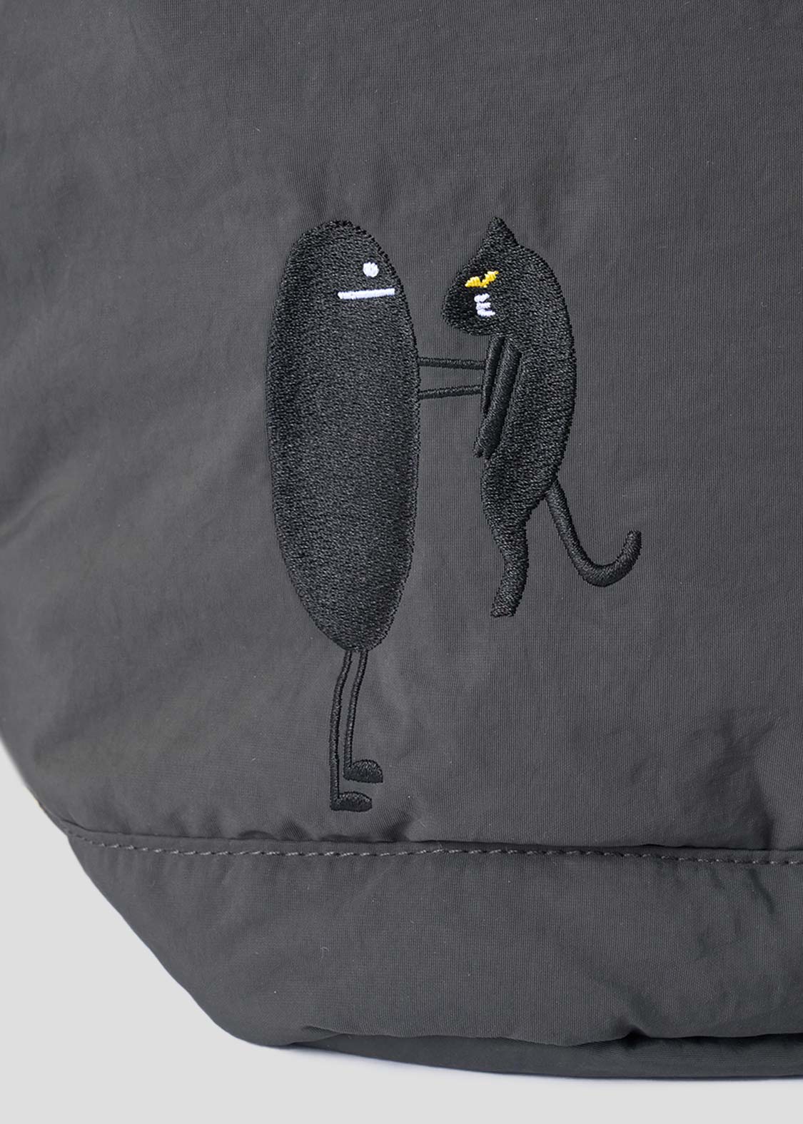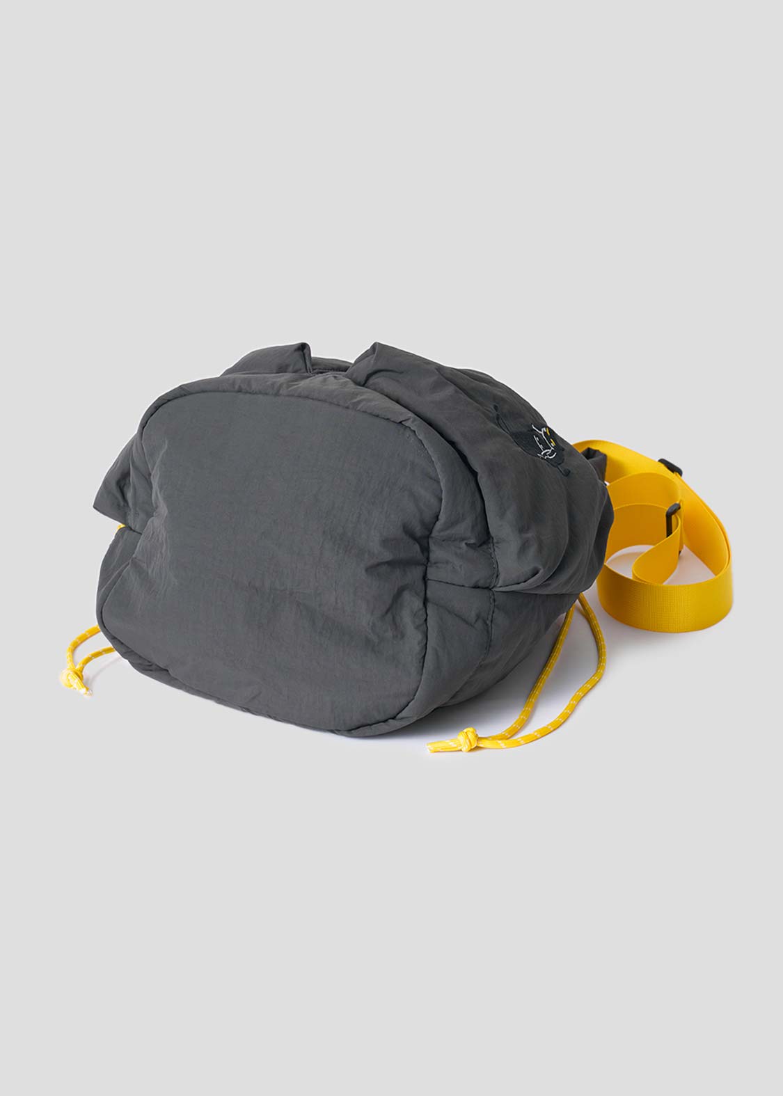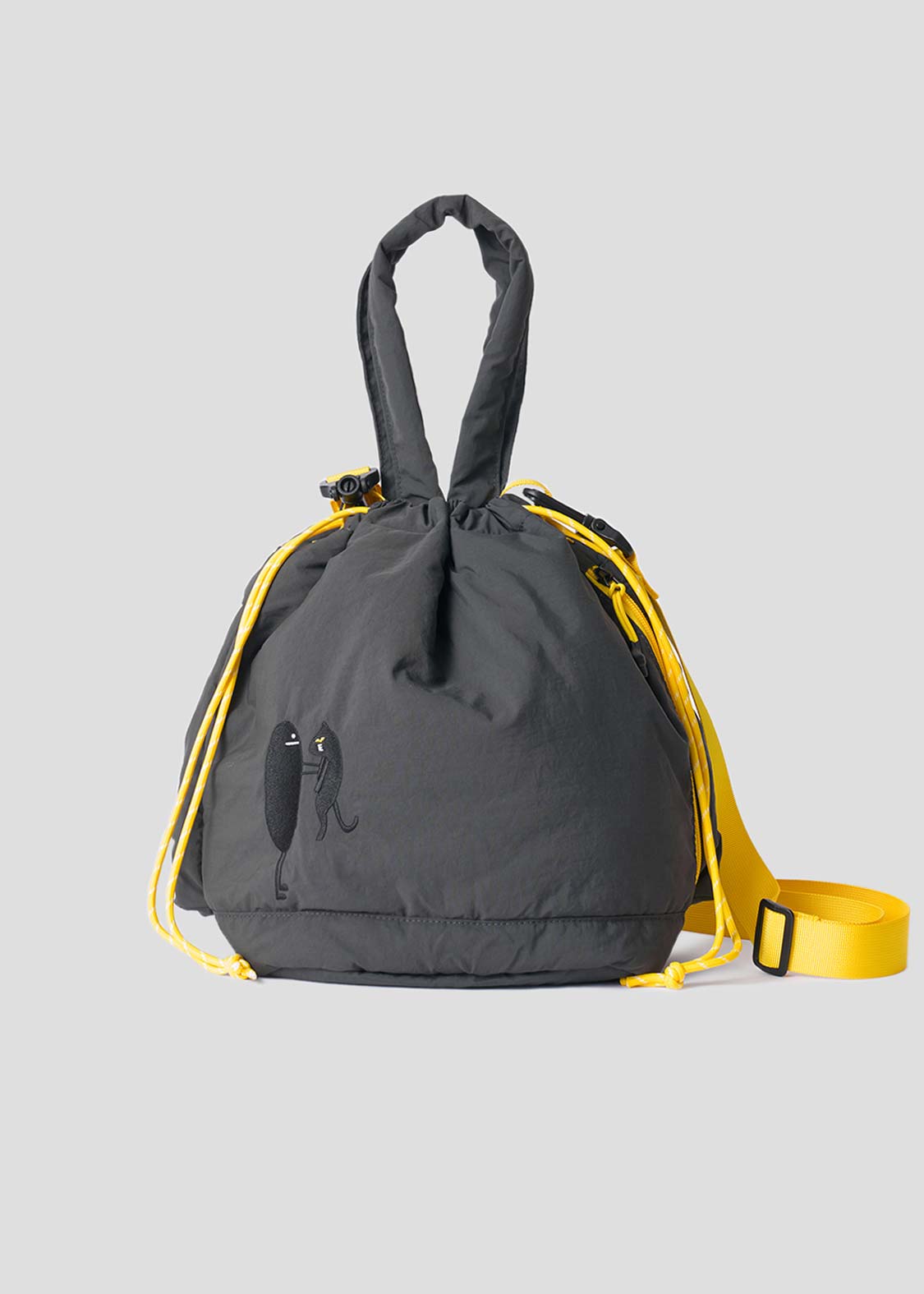 ・光沢感のあるポリエステル生地を使用した巾着バッグ。